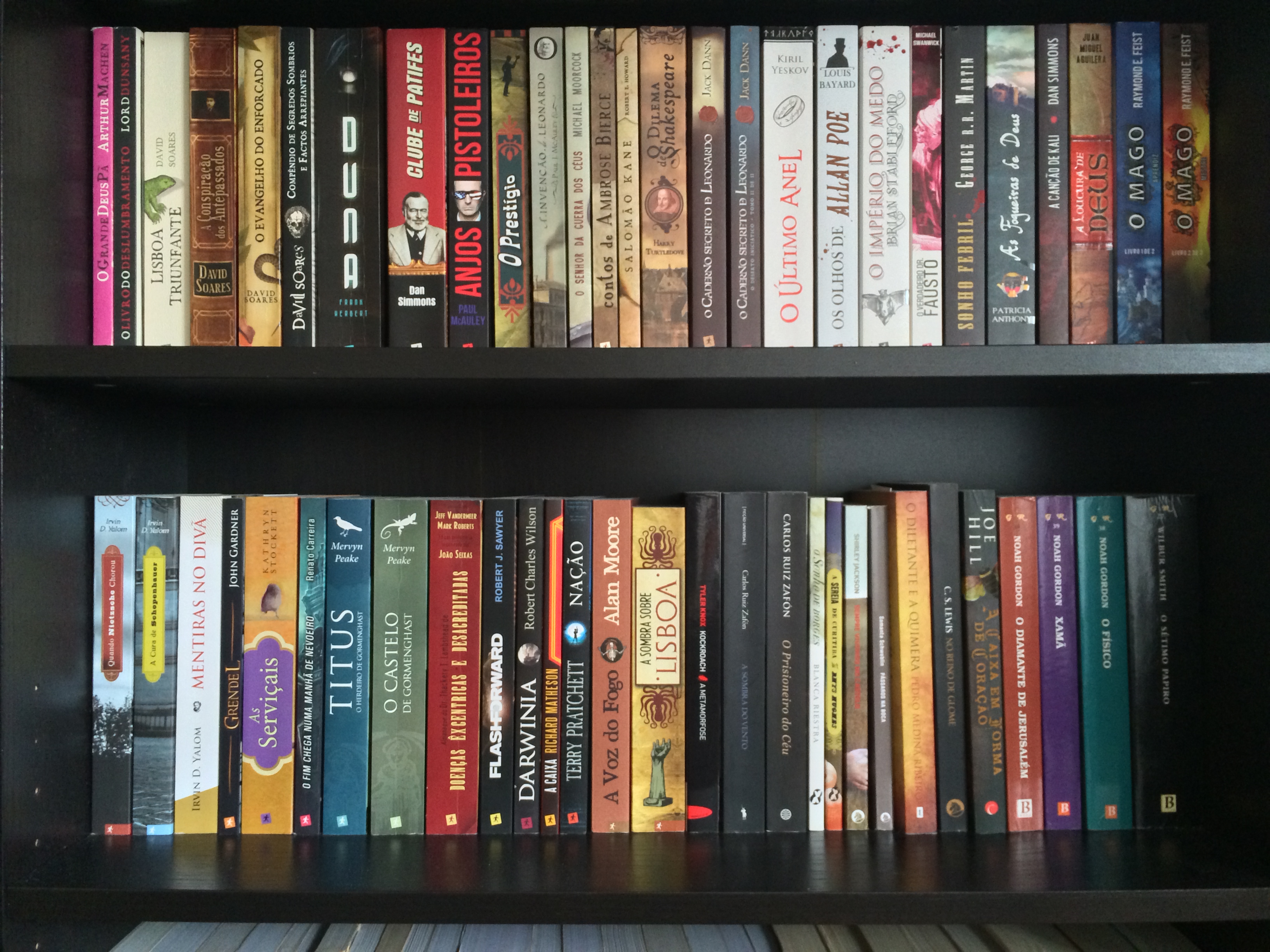 Também nestas duas prateleiras estão os restantes livros da Livros de Areia, por terem um formato maior: Sereia de Curitiba de Rhys Hughes e O Sonho de Borges de Blanca Riestra. Outros livros que relembro com saudade são os da Cavalo de Ferro: Sempre vivemos no Castelo e Pássaros na Boca; ainda que o segundo me desperte sentimentos contrastantes por apresentar histórias bastante interessantes e marcantes, entre outras vulgares.