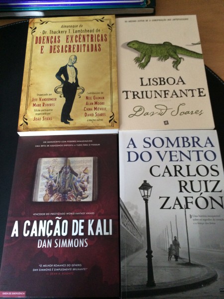 Finalmente, segue-se A Sombra do Vento de Carlos Ruiz Zafon que adorei, e alguns dos livros da Saída de Emergência. Almanaque do Dr. Thackery T. Lambshead é um compêncio de doenças absurdas organizado por Jeff Vandermeer. A edição portuguesa tem, para além das doenças compiladas por Jeff Vandermeer, várias escritas por autores portugueses. Finalmente, Lisboa Triunfante, de David Soares, explora uma Lisboa de outros tempos, em torno de dois animais: o lagarto e a raposa; e o assustador A Canção de Kali de Dan Simmons, que explora o choque cultural e os cultos à deusa da morte e da destruição, Kali.
