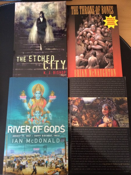 Por sua vez, City of Saints and Madmen, de Jeff Vandermeer apresenta-nos a cidade de Ambergris em vários contos fantásticos, onde se destaca a influência dos fungos (sejam cogumelos ou esporos). De destacar que esta edição tem um conto extra, na própria capa. Finalmente, não podia faltar a referência a River of Gods de Ian McDonald, uma obra brutal que cruza várias histórias num futuro pouco distante, numa cultura bastante diferente da ocidental. Destacam-se as várias personagens que apresentam pontos de vista diferentes numa sociedade marcada por diferenças abismais de riqueza, e onde a tecnologia impera.