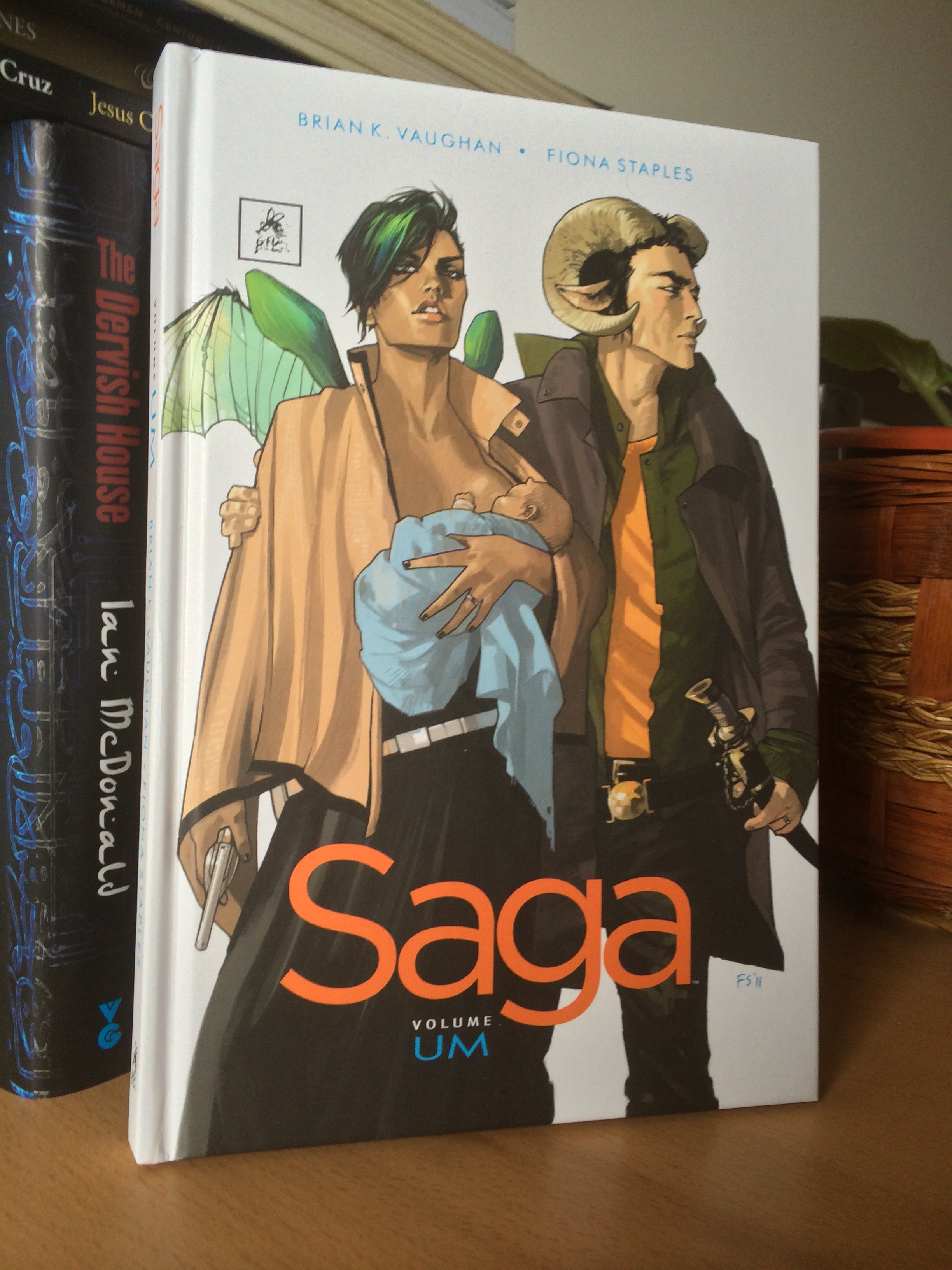 Na capa vemos uma mulher com asas e um homem com chifres, ambos de armas na mão: a antevisão de uma confluto armado que não nos prepara para as primeiras páginas, carregadas de delicioso nonsense e confusão violenta. Entre impropérios característicos, numa garagem pouco apropriada, a mulher, Alana, está a dar à luz, assistida apenas por Marko. O resultado: um bebé de asas e chifres, consequência da união dos dois. Ainda não recompostos, vêem-se encurralados por uma milícia armada que os tenta capturar. Felizmente, em seu auxílio vem um grupo que, recorrendo á magia, lhe concede tempo suficiente para fugir.