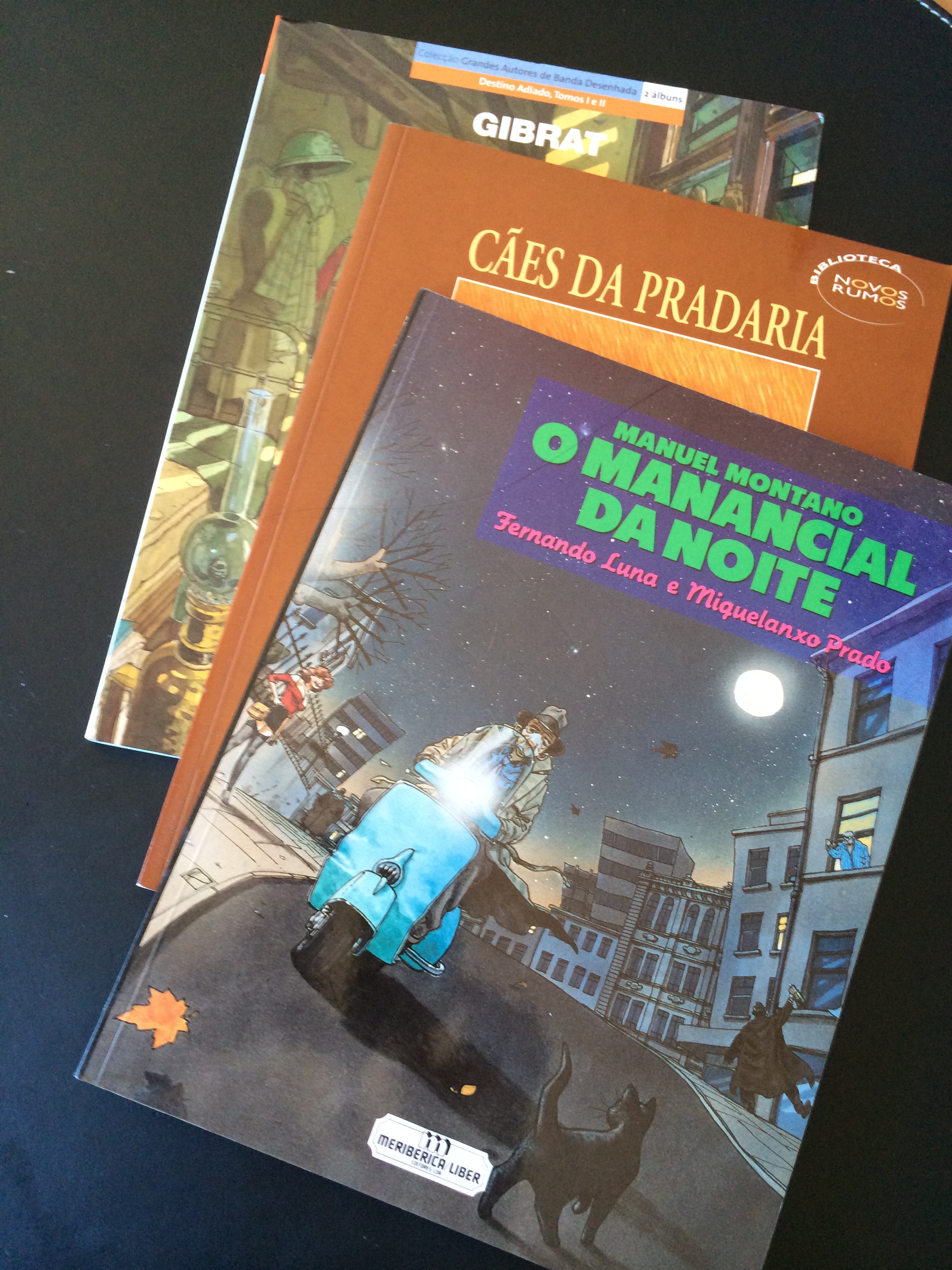 Na mesma altura, uma passagem inesperada pelos alfarrabistas da rua da Anchieta, cruzou mais umas coisitas no meu caminho. O primeiro, O Manancial da Noite chamou-me à atenção pela participação de Miguelanxo Prado e será a história de um detective que procura o Manancial da Noite (podem ler um comentário resumido em Bedeteca Ideal). Já Cães da Pradaria atraiu-me pela capa, onde um cavalo arrasta um caixão, acompanhado pelo homem que o cavalga e uma criança a pé, paisagem inóspida e vazia de mais detalhes, a não ser uma longa sombra que se arrasta. O terceiro é Gibrat, numa edição publicada pela Asa em conjunto pelo Público.