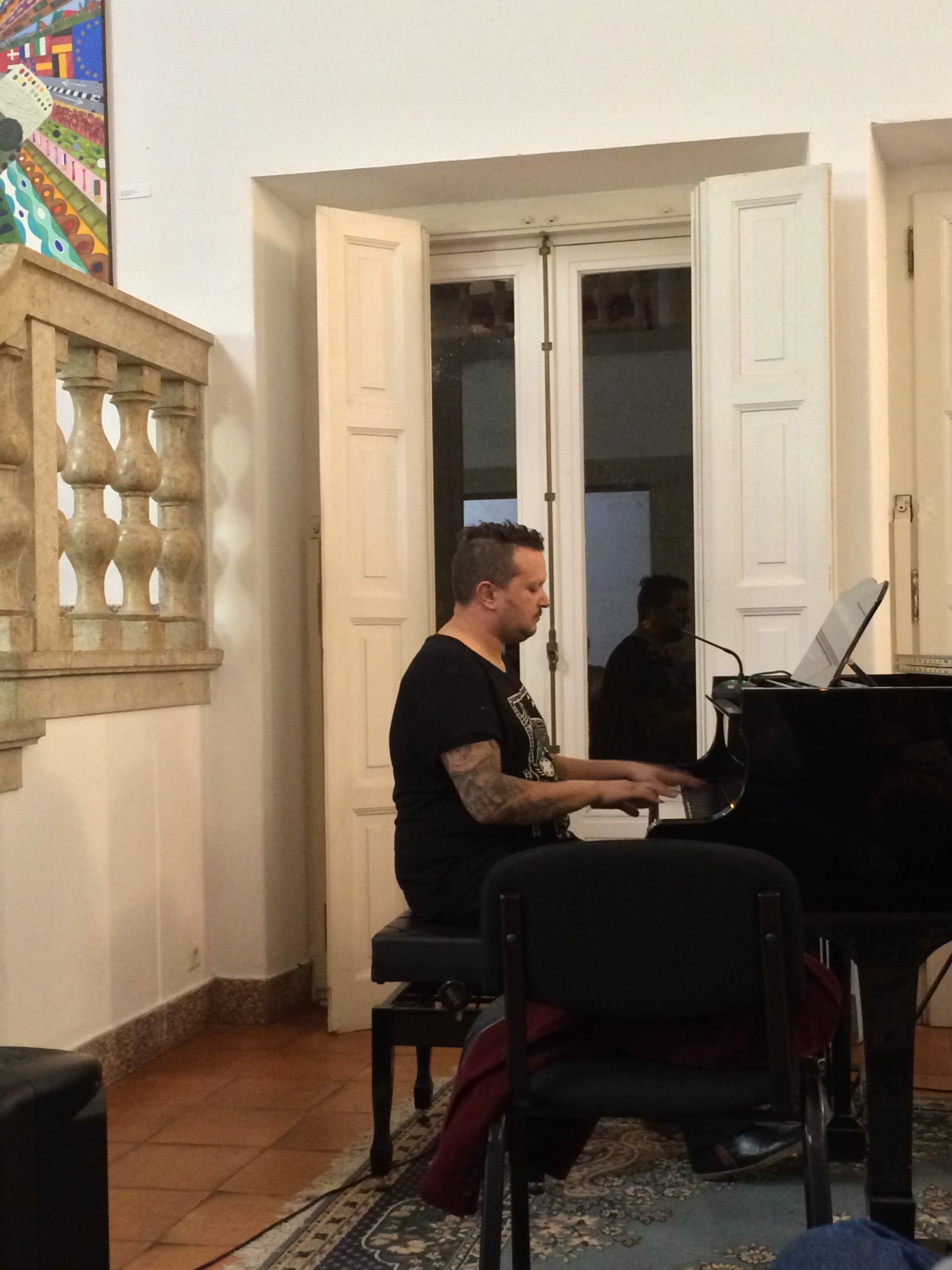 Após uma curta apresentação inicia-se a noite, com a declamação de poemas de horror, por Pedro Nunes Sazabra, mais propriamente dos poemas O Adão Inverso e Um Mal Fascinante de Baudelaire. Componente curta da noite, mas em que a voz iniciou o tom negro que marcou esta sessão. Seguiu-se a interpretação do tema A Água Benta, de Chanson Noire. Assim que se senta o artista põe-se à vontade e revela uma voz espectacular que enche o espaço. Bem, espectacular talvez não seja bem o termo – a palavra que me vem à cabeça é mesmo brutal, pelas inflexões com que acompanha e se sobrepõe ao piano. Perde a visualização de qualquer vídeo quando comparada com a versão ao vivo – e mesmo não apreciando especialmente este género de música, este foi um dos grandes momentos da noite.