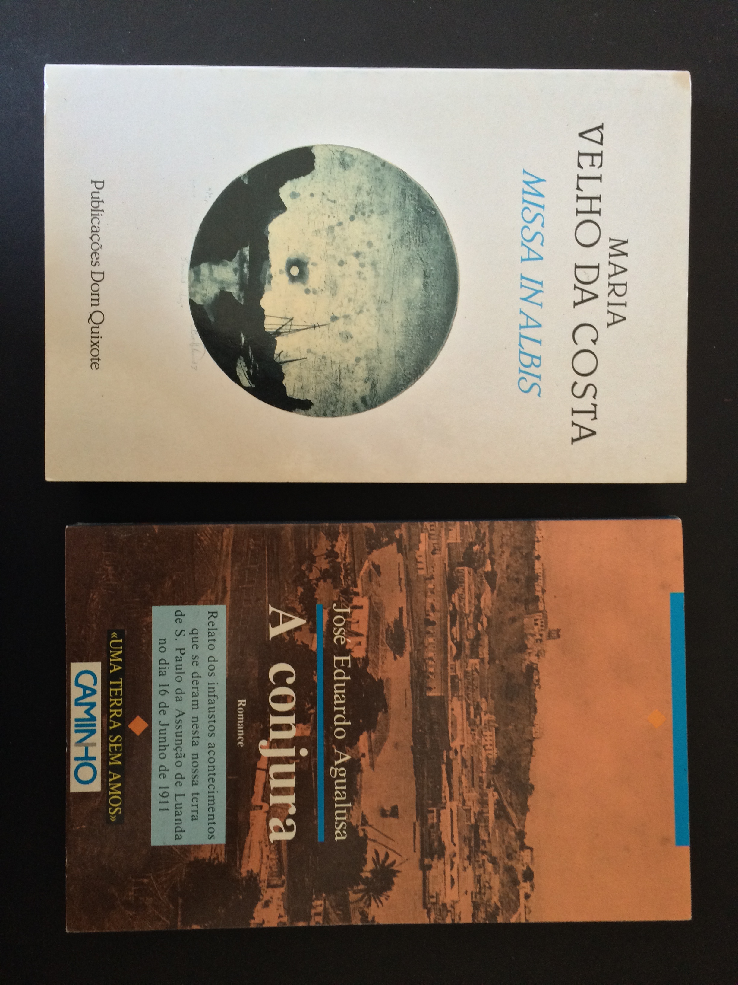 Aqui estão duas primeiras edições, dois livros que provavelmente nunca foram lidos – as páginas custam a abrir. A conjura de José Eduardo Agualusa retratará sonhos africanos de há largos anos: