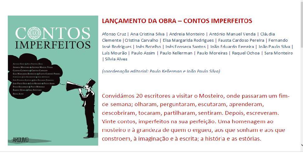 Eventos, Ficção, Literatura, Livros, Nacional Eventos: Lançamento Contos Imperfeitos Date: Janeiro 31, 2016Author: Cristina Alves 0 Comentários Onde e quando? No Auditório do Mosteiro da Batalha, pelas 16h do dia 06 de Fevereiro. Classifique isto:Partilhar isto: Clique para partilhar no Facebook (Abre numa nova janela) Facebook Carregue aqui para partilhar no Reddit (Abre numa nova janela) Reddit Click to share on X (Abre numa nova janela) X Clique para partilhar no Tumblr (Abre numa nova janela) Tumblr Carregue aqui para enviar por email a um amigo (Abre numa nova janela) E-mail Clique para partilhar no Pinterest (Abre numa nova janela) Pinterest Clique para partilhar no Pocket (Abre numa nova janela) Pocket Gosto Carregando... Relacionado