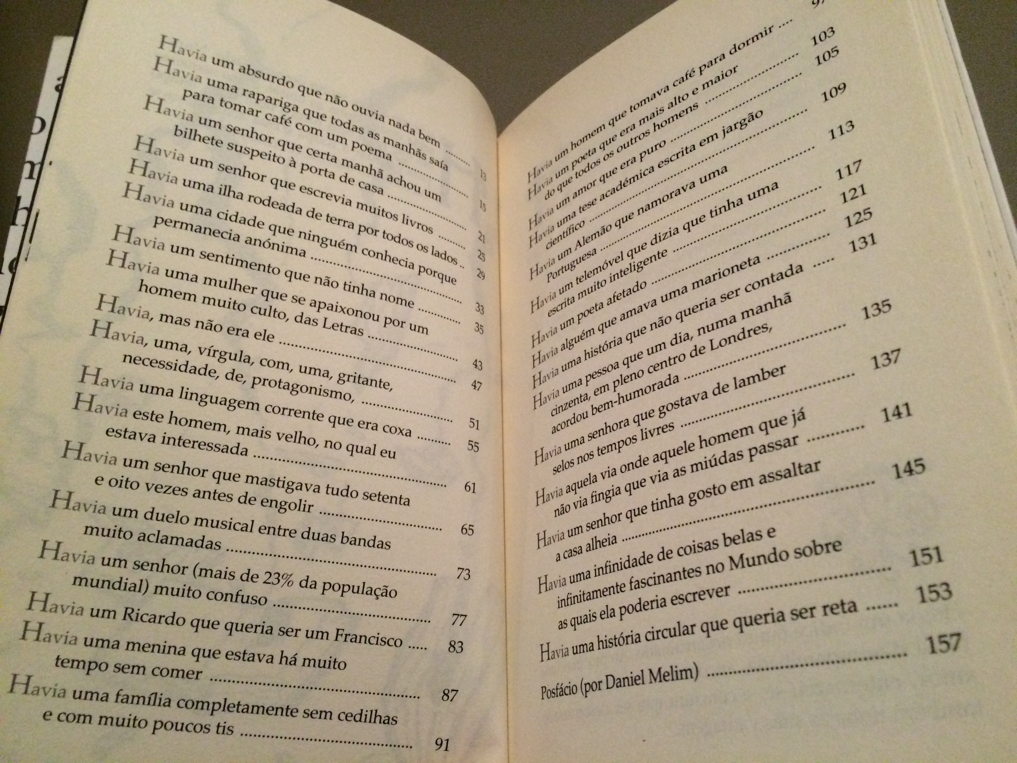 As duas curtas histórias presentes na capa do livro são dois bons exemplos da escrita que vamos encontrar no interior – pequenas histórias engraçadas mas bem contidas, todas iniciadas com a palavra Havia.