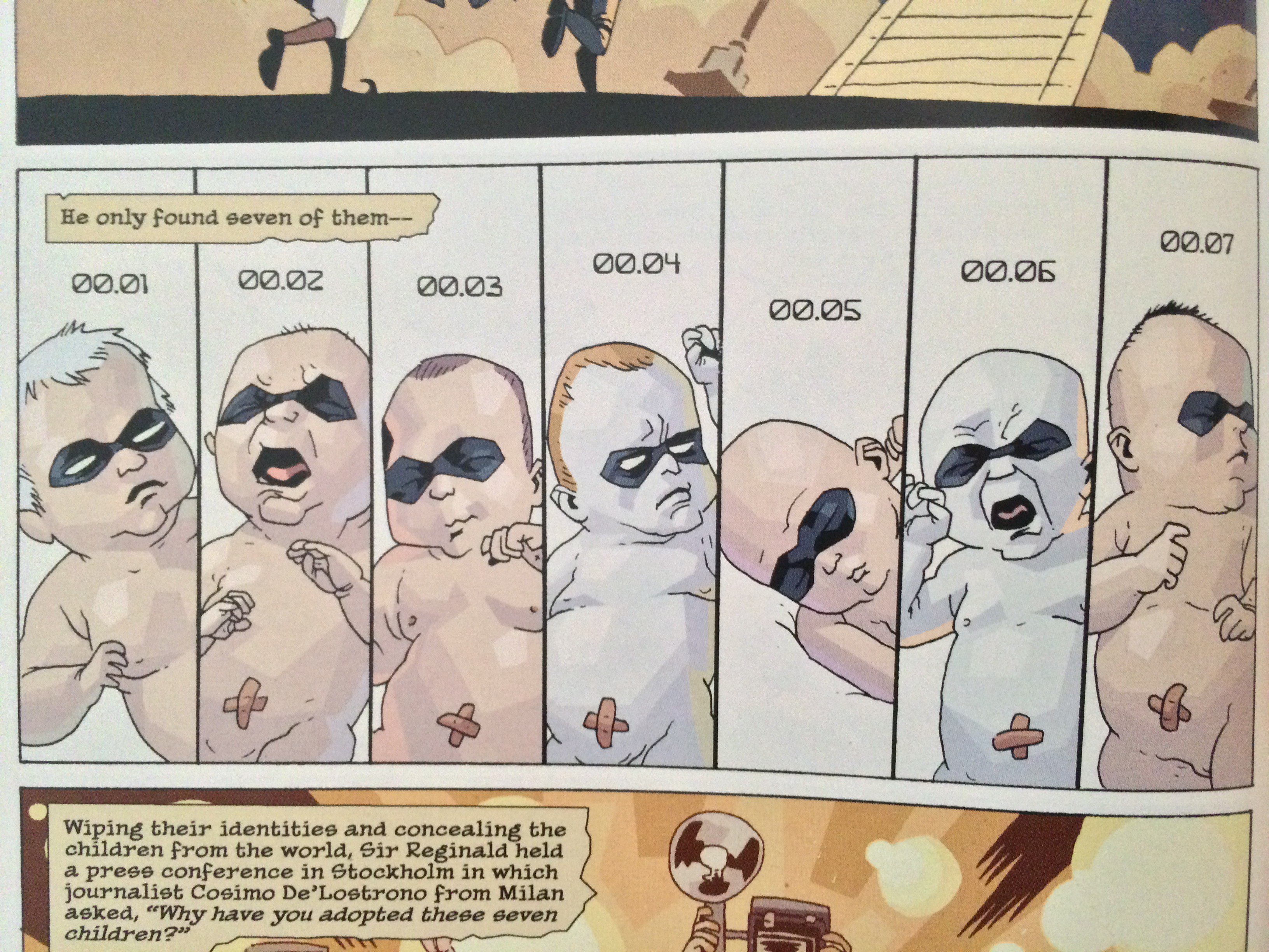 Cruzando elementos de ficção científica e de fantástico, numa pequena história com vários enigmas, apresenta-nos uma família claramente disfuncional que originou vários heróis e uma vilã – desenvolvimento cliché, expectável pelas primeiras páginas, mas que mesmo assim não estraga a genialidade da história que deriva dos detalhes dementes.
