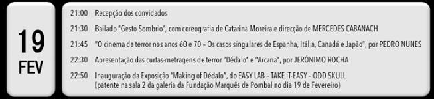 Após o curto intervalo apresentaram-se duas curtas de terror portuguesas: Dédalo e Arcana. A primeira um óbvio tributo a Alien (abaixo o trailler), uma curta que mistura elementos de ficção científica e horror, enquanto a segunda, Arcana, possui alguns elementos mais tradicionais, com referência aos bruxedos e à Dama Pé de Cabra.