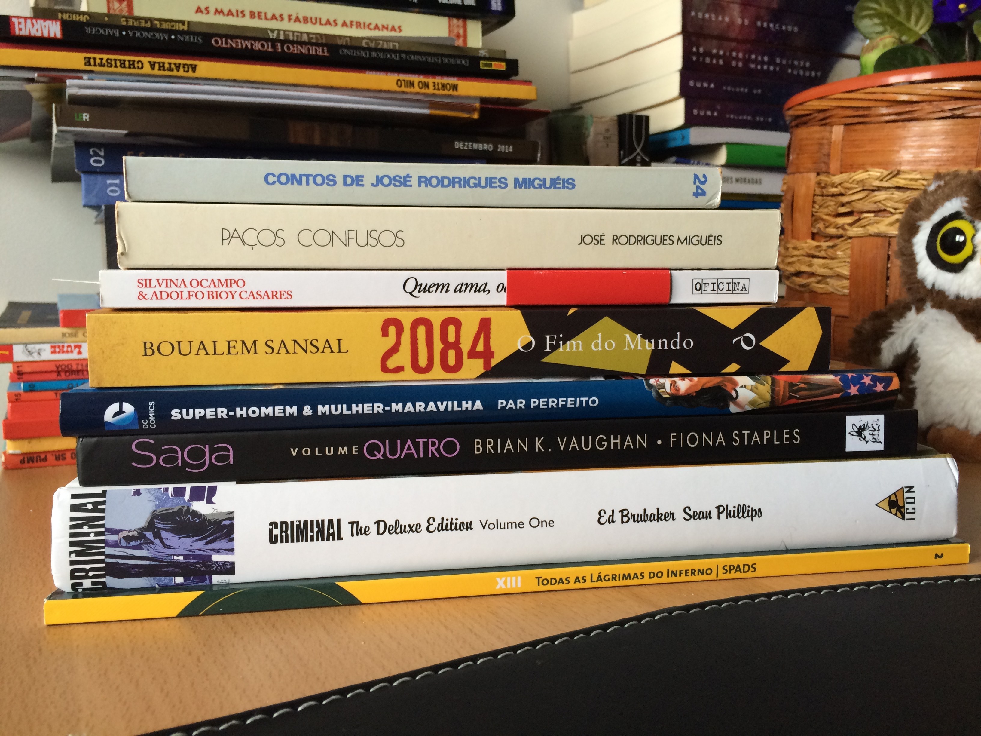 À esquerda eis o quarto volume de Saga, uma série de banda desenhada que cruza perfeitamente ficção científica e fantasia para nos dar uma história mirabolante com seres humanóides estranhos em aparência mas revelando todas as características emocionais de seres humanos. A série tem sido uma das mais premiadas e é efectivamente uma das melhores que tive oportunidade de ler.