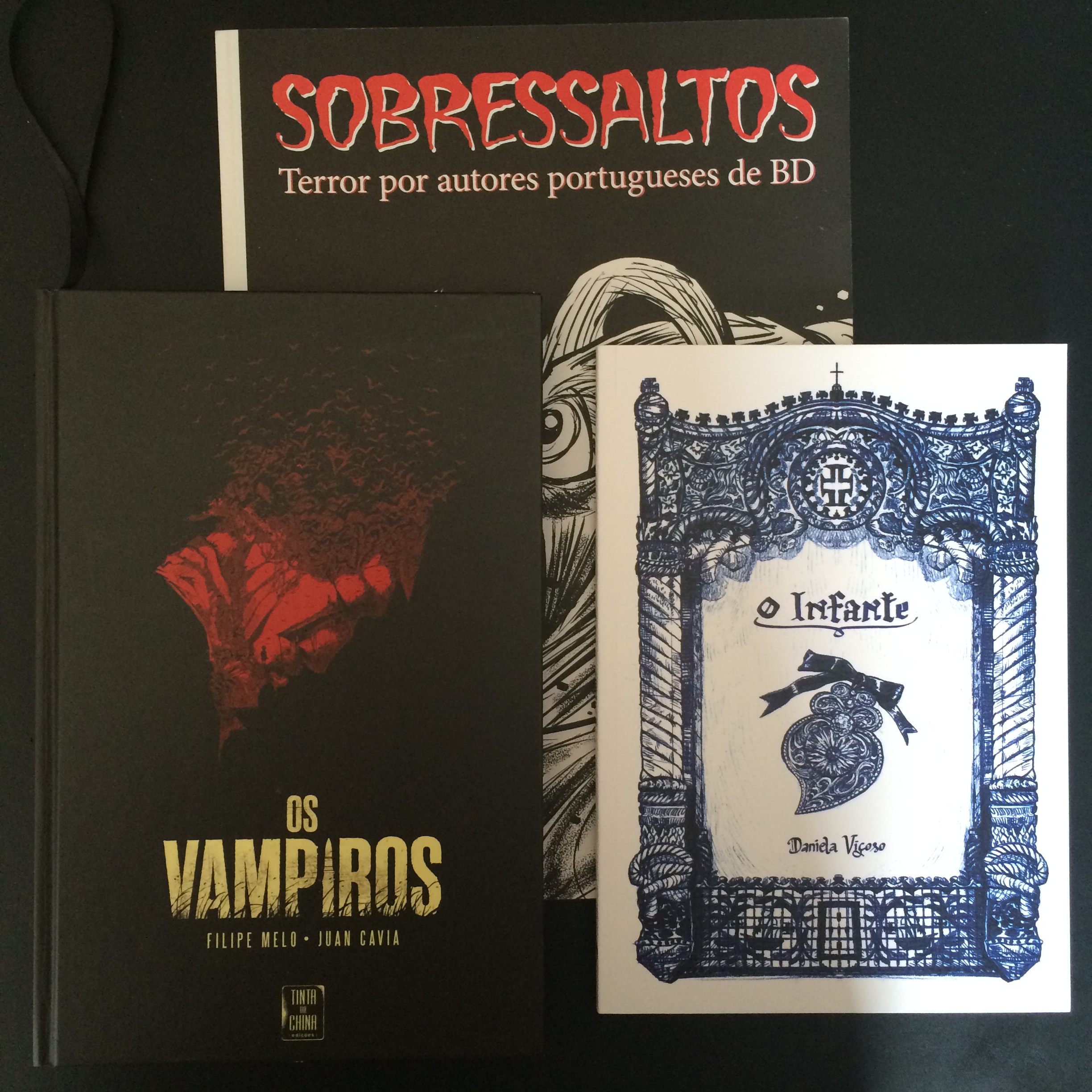 Finalmente, três produções nacionais recentes de banda desenhada. Sobressaltos já foi por aqui falado diversas vezes e reúne as histórias expostas numa das sessões de Sustos às sextas – histórias de horror de duas páginas de vários autores que conseguem apresentar vários tons e estilos. Por sua vez, O Infante de Daniel Viçoso parece apresentar uma perspectiva interessante da história portuguesa. Em último encontra-se um dos grandes lançamentos no mercado português, Os Vampiros, a nova banda desenhada de Filipe Melo e Juan Cavia que decorre durante a Guerra Colonial, na Guiné em 1972.