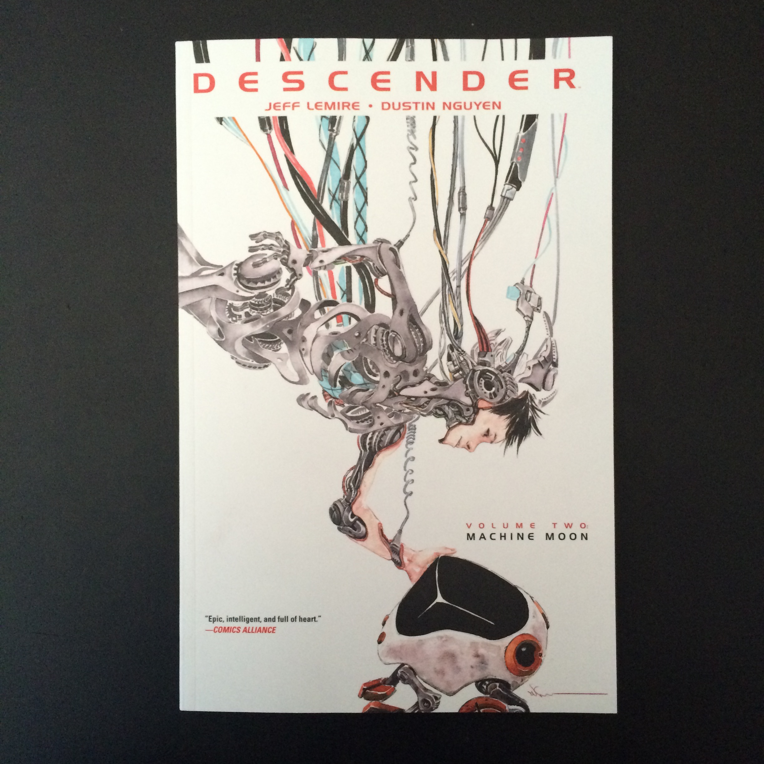 Finalmente, Machine Moon é o segundo volume da série de banda desenhada Descender, que me conseguiu cativar no primeiro – a acção decorre num Universo onde os seres humanos habitam vários planetas e os robots têm um papel preponderante nas tarefas diárias. Até se revoltarem. O aparecimento de robots inteligentes será tão antigo quanto a humanidade mas os novos robots terão sido contaminados por um pedaço de código de origem suspeita. Com detalhes que me fizeram pensar em Battlestar Galactica e em A.I (a história do pinóquio, a criança robot que apenas quer ser um rapaz real) tornou-se uma série que tentarei seguir pelos próximos volumes.