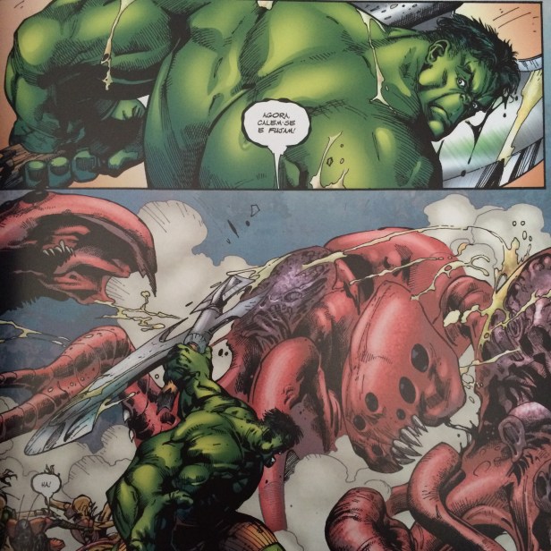 Hulk não é a única personagem poderosa e, de confronto em confronto, sucedem-se as grandes, detalhadas e maravilhosas batalhas que estimulam visualmente o leitor, criando páginas belíssimas e esmagadoras – um planeta alienígena proporciona todas as mais dementes possibilidades e entre monstros gigantescos e horrendos encontramos guerreiros que cruzam as mais animalescas características.