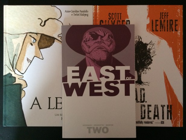 103 – East of West Vol.2 – Hickman, Dragotta e Martin – Depois da novidade estrondosa do primeiro volume, este continua as várias histórias paralelas acompanhando os cavaleiros do apocalipse nas suas demandas. Morte prossegue em busca do filho, enquanto os restantes tentam travar os seus avanços e concretizar uma profecia de rimas obscuras;