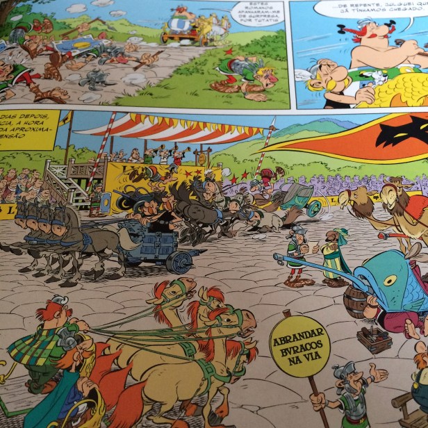 A nova aventura de Astérix leva-os pela Península Itálica numa corrida desenfreada e carregada de peripécias! Sugerida pelo senador responsável pelas vias romanas, quando acusado de as negligenciar, a corrida envolve representantes dos vários povos sob domínio romano. Mas claro que os romanos têm de vencer a todo o custo e para tal existem uma série de artimanhas – não contam é com a presença de Astérix e Obélix na corrida!