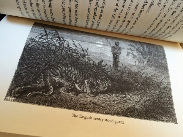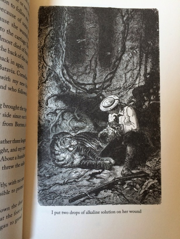 “Eaten by the tiger, Captain”. (..) That’s just an english custom that we have adopted. And it’s an excellent one as you shall see. The English noticed that one often meets in our forests an animal which didn’t expect – a tiger, for exempla, or a jaguar or a panther. Now, all these animals that get up early in the morning like us, that get hungry like us, and that live by hunting, and that have no other means of existence – well they often wait for a traveller on the corner of a path, in the hope of a breakfast. Moreover, since they don’t like do attack a human whose face they can see, they almost always jump on you from behind, at the moment you least expect it, and carry you off into the jungle to eat at their leisure.