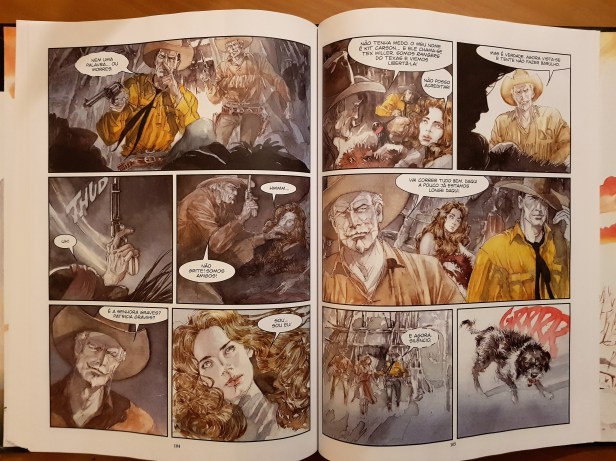 A colecção Bonelli começa com Tex, um herói já conhecido pelo público português através da Polvo, e que celebra, em 2018, 70 anos de existência. Confesso que nunca tinha lido Tex e que peguei neste livro à espera de um Western típico, que me recordasse os livros de pequenas aventuras no faroeste – e foi o que encontrei mas este volume surpreendeu-me por ter pontos inovadores na forma como o herói encara os seus inimigos e na forma como desenlaça o conflito.
