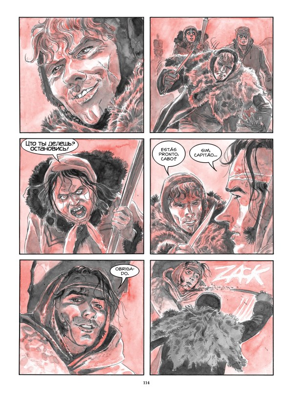 Sangue e Gelo, passa-se no início do século XIX quando o Grande Exército napoleónico desgastado pela estratégia russa da “terra queimada”, retira através de um deserto de neve deixando atrás de si centenas de milhares de homens à fome, que lutam pela mera sobrevivência num ambiente de horror. Um pedaço de pão e um fogo em torno do qual se aquecer é tudo o que os homens do capitão Lozère querem. Quando um brilho distante, quente e convidativo, aparece sob o cinzento mortal do céu, a esperança parece renascer … No entanto, é como se no ar frio e sombrio houvesse algo sinistro, uma sensação ingrata, uma presença sem rosto aguardando a sua chegada com paciência imortal.