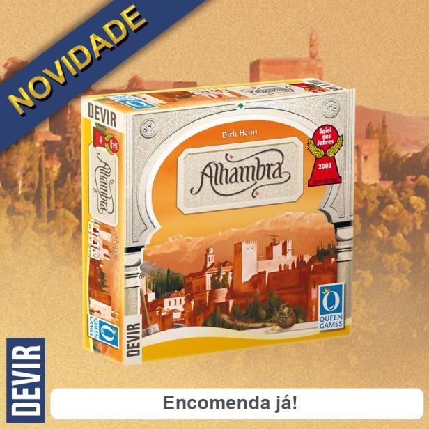Também bem colocado no BGG (lugar 394), Alhambra é outro dos lançamentos da Devir. Vencedor do prémio Spiel des Jahres de 2003, é já um clássico de estratégia que possui vários mecanismos: card drafting, hand management, set collection e tile placement. De aspecto mais clássico, tem como palco a cidade de Granada que em 1278 estava em construção, integrando arquitectura europeia e árabe. O objectivo do jogo será construir a cidade, havendo necessidade de pagar o seu preço que pode estar numa das quatro moedas diferentes – sim, pelo que percebi, durante o jogo é necessário gerir quatro tipos de moedas e os seus câmbios.
