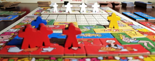 Porque considero que Arraial tem um visual peculiar? Por um lado porque tem um tema tipicamente português, pretendendo reflectir as festas de Verão com grelhados (sobretudo sardinhas) e música popular. Por outro lado, porque o desenho é de Nuno Saraiva, no estilo que lhe é tão característico, fornecendo às peças um cunho específico apesar do formato Tetris conhecido – e mesmo as peças de formato igual possuem desenhos diferentes resultando numa boa diversidade gráfica.