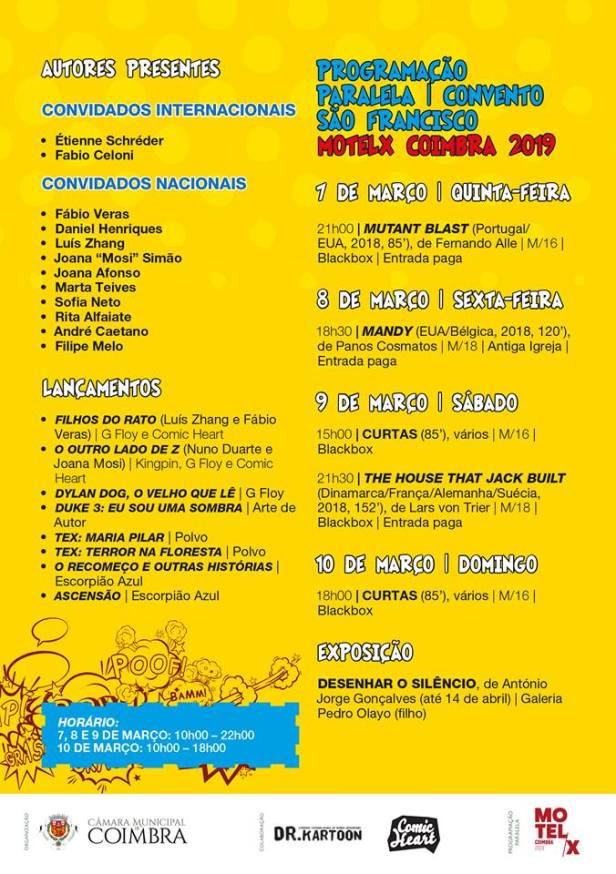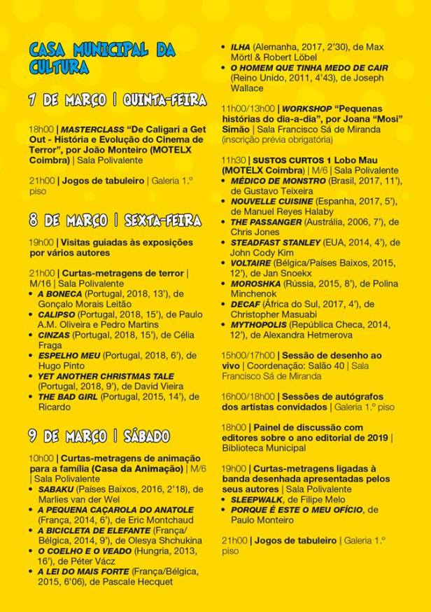 O programa possui vários elementos interessantes. Destaco logo a primeira Masterclass do dia 07 de Março com João Monteiro sobre cinema de horror, bem como a projecção de duas curtas-metragens associadas à banda desenhada: Sleepwalk (adaptação da banda desenhada de Filipe Melo e Juan Cavia) e de Porque este é o meu ofício de Paulo Monteiro. Para mais detalhes sobre o evento (para além do programa abaixo publicado) podem consultar a página oficial: