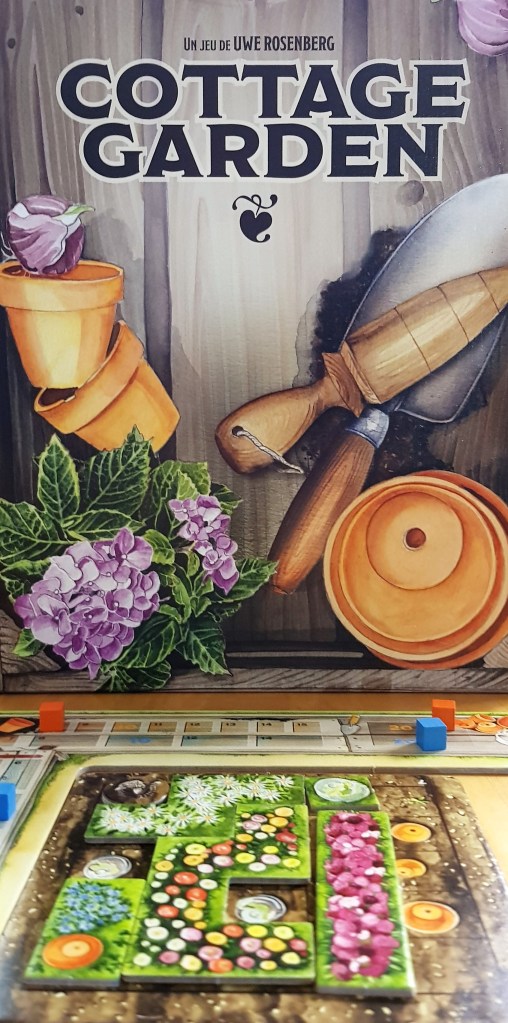 Cottage Garden foi o próximo escolhido – um jogo de Uwe Rosenberg, reconhecido cá em casa como o autor dos muito jogados Agrícola e Patchwork. Ainda que, em termos de mecânica base, Cottage Garden seja semelhante ao Patchwork (escolhendo-se uma peça e colocando-a num tabuleiro) possui algumas diferenças, sendo a principal, o número de jogadores – enquanto que o Patchwork só pode ser jogado por dois jogadores, o Cottage Garden possui um modo solo e pode ir até quatro.