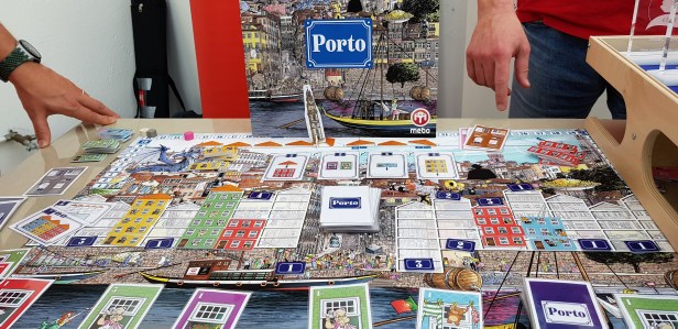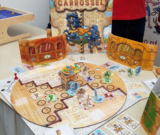 Para além da mais usual actividade neste tipo de evento (jogar, claro) existiam palestras sobre jogos de tabuleiro, bem como editoras a mostrar as próximas novidades. Não pude assistir a algumas das que planeava, mas as duas ofertas da MEBO para os próximos tempos são visualmente muito interessantes – um jogo de colocação de peças que se inspira na baixa ribeirina do Porto (de nome Porto) e um jogo que se baseia nos carrocéis para apresentar um mecanismo de jogo particular (de nome Carrocel).