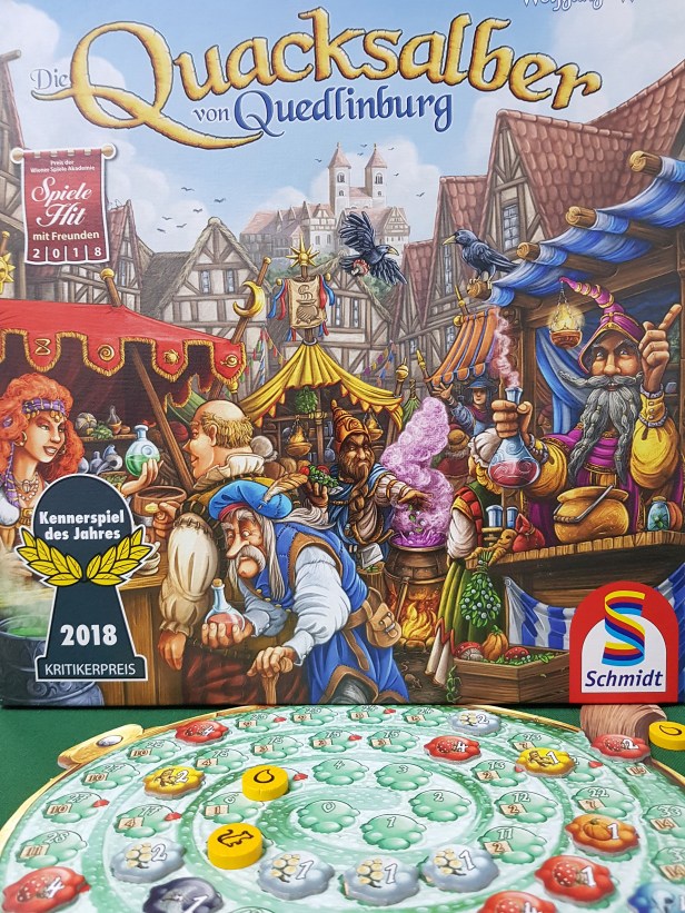 A seguir pegámos no vencedor do Spiel des Jahres de 2018 para a categoria de conhecedores – o The Quacks of Quedlinburg. Trata-se de um deck building (neste caso num saco) com push your luck em que temos, como o nome dos mecanismos indica, de ir construindo um conjunto de possibilidades com peças de várias cores no nosso saco e de as ir retirando, uma a uma, até querermos parar ou até ultrapassarmos uma determinada quantidade de dano (sofrendo, neste caso, penalizações).