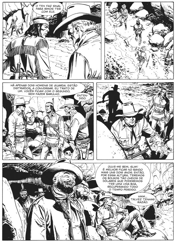Nizzi aproveitou para dividir o protagonismo deste relato pelos quatro pards habituais, sozinhos e/ou em grupo reduzido, enquanto Brindisi recriou com bastante credibilidade as vastidões do deserto e, com bastante distinção, ultrapassou aquele que é recorrentemente um dos maiores obstáculos para quem se inicia em Tex: o desenho dos cavalos.