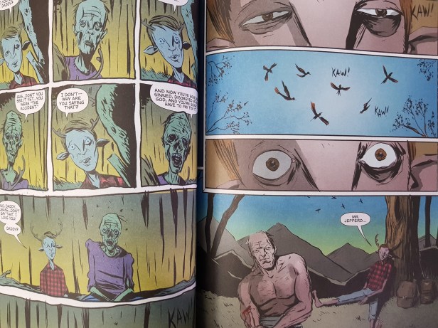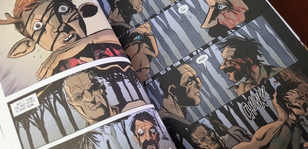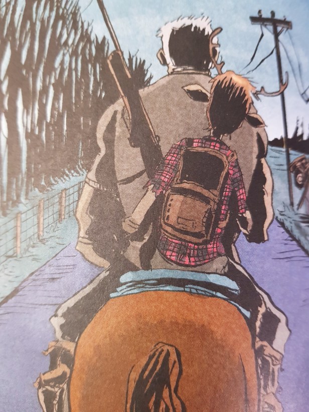 Ainda assim, existem alguns, poucos, que tentam estabelecer alguma justiça, como o homem que encontra o rapaz. Homem duro, capaz de lutar e de fazer o que é preciso, tem várias atitutes ao longo da história que não se coadunam com a entrega do rapaz aos maus da fita – algo que Jeff Lemire justifica e que decerto gerará o motor narrativo do próximo volume.