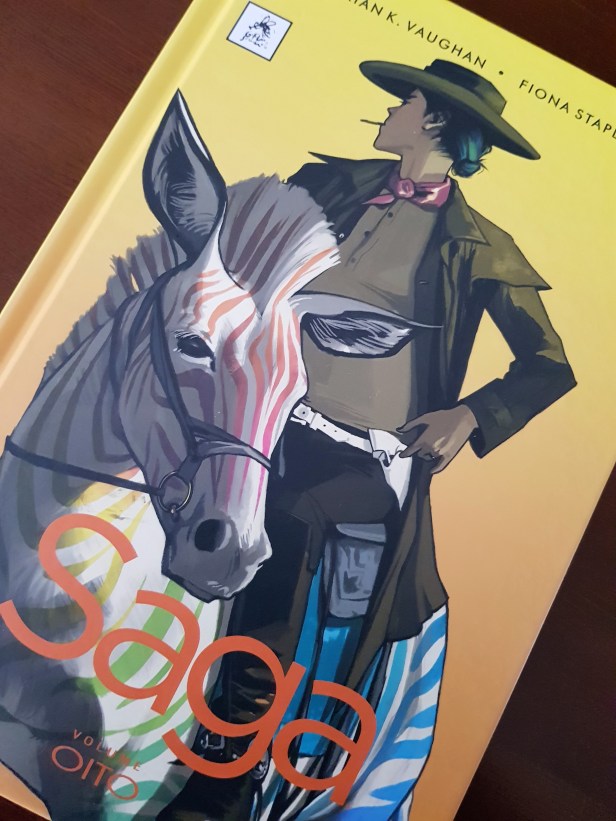 Em Saga o conceito de família é algo fluído. Sim, existe mãe e pai, bem como avôs (nalgumas partes da história), mas criar uma criança requer trabalho (como diz o ditado inglês “It takes a village to raise a child” ) e toda a ajuda é preciosa. Neste caso vem de amigos (ou inimigos) que se juntam à eterna viagem no espaço. Há sempre mais um lugar para ir. Neste volume a família desloca-se a alguém que possa resolvar a gravidez de Alana levando-os a um novo planeta com personagens peculiares, pois a criança estará morta dentro da barriga.