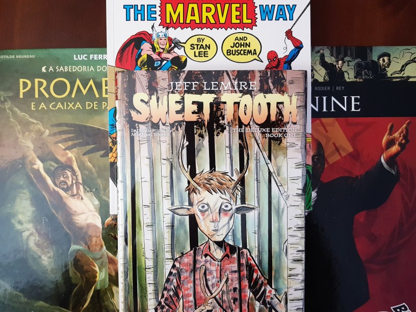 73 – Sweet Tooth – Book one – Jeff Lemire – Desta vez o autor leva-nos para um cenário apocalíptico em que uma doença desconhecida acaba com a espécie humana. Paralelamente, todos os novos seres humanos nascem com características de animais, algumas mais óbvias do que outras. Na sua maioria apresentam atrasos mentais. Mas, sendo um livro de Lemire, a história foca, sobretudo, o lado humano das duas personagens principais, um rapaz com hastes e um homem que o descobre e promete levá-lo para uma reserva;