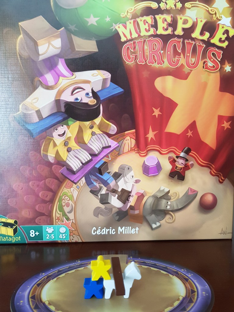 Meeple Circus chegou este Natal mas já nos cativou! Neste jogo cada jogador tem de escolher bonecos para construir os padrões solicitados pelo público! Se o conseguir fazer tem pontos por cada padrão que concretizar! Adicionalmente, recebe pontos por conseguir colocar bonecos azuis no chão e bonecos amarelos no ar, bem como pela altura dos bonecos vermelhos (medida por uma régua especial). A prova final tem elementos adicionais, em que cada jogador deve bater palmas a cada peça colocada, ou cantarolar durante toda a música!