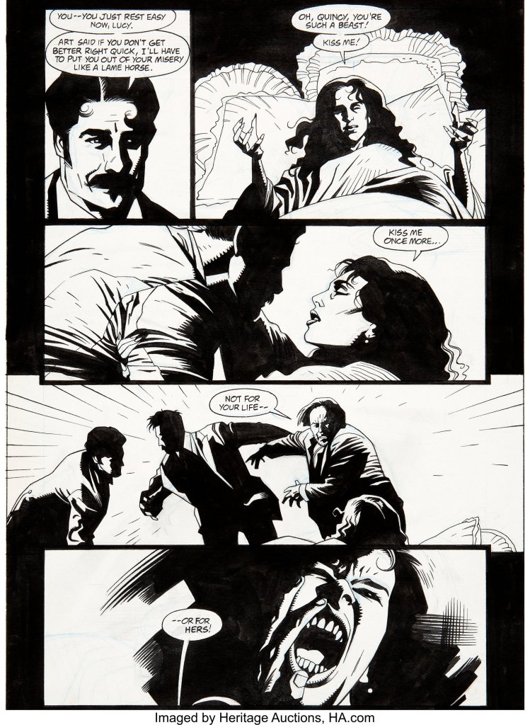 Ao contrário das minhas expectativas, a narrativa também flui – por mestria do desenho. Sem grandes dissertações, mostrando mais do que diz, o livro conseguiu cativar-me o interesse, apesar de ter lido o livro original. O Dracula é o monstro. Forte, poderoso, sedento de sangue – mas que também procura uma alma que queira imortalizar-se ao seu lado, vendo em Mina uma possível candidata.