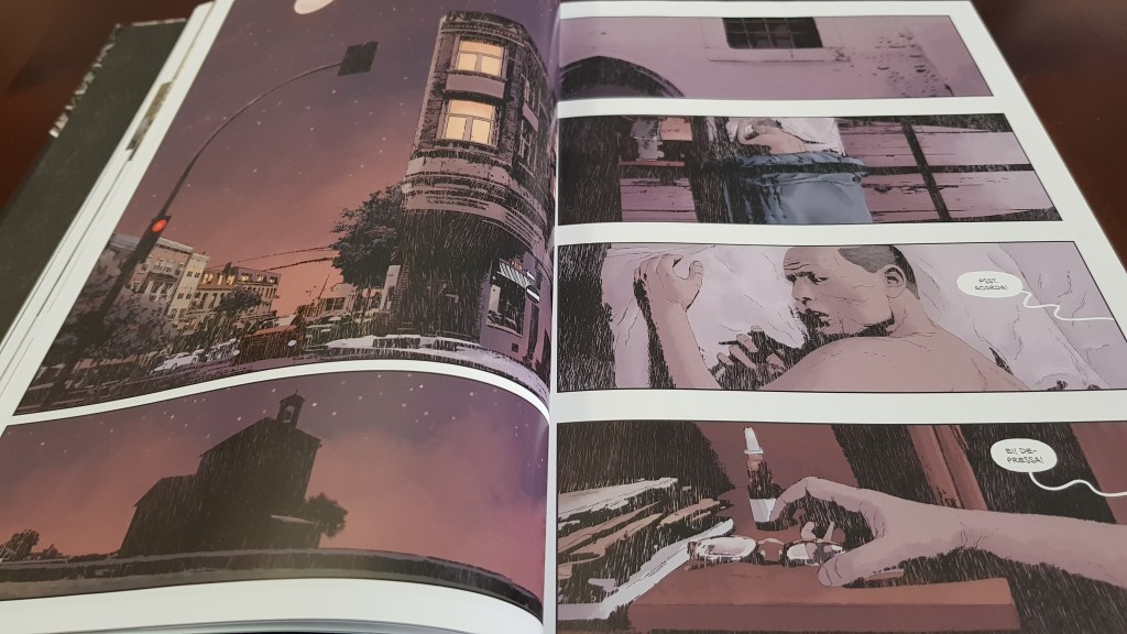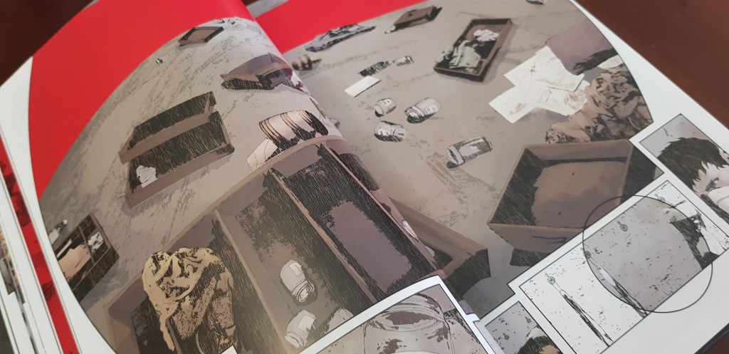 O desenho é quase sempre muito realista, de cores muito acizentadas, salvo pelo ocasional vermelho vivo que tem um objectivo claro de realçar determinados acontecimentos. E ainda que não seja o meu género de desenho (pelo traço demasiado leve e pela pouca definição das imagens), neste caso conjuga-se muito bem com a narrativa, expressando a mesma pouca definição do horror que está em todas as páginas.