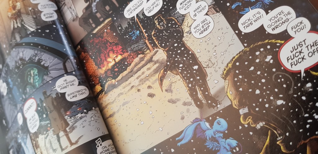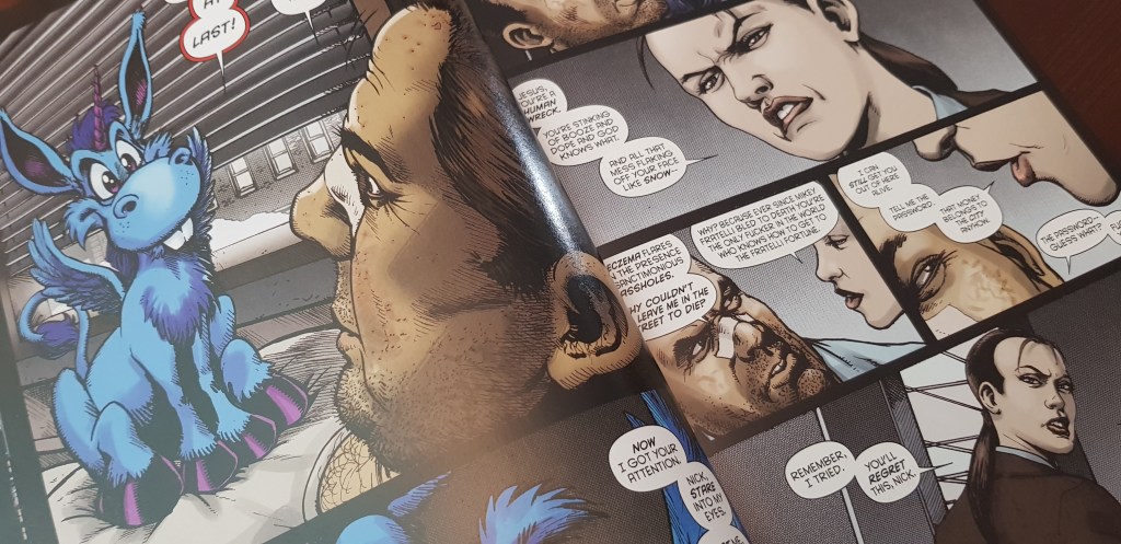 A chacina inicial coloca-o como alvo preferencial da máfia e, consequentemente, dos polícias corruptos. Nada que não tenha sido explorado já noutras narrativas. Mas o que aqui se destaca é que Nick acorda no hospital com visões peculiares – um pequeno unicórnio voador e azul!