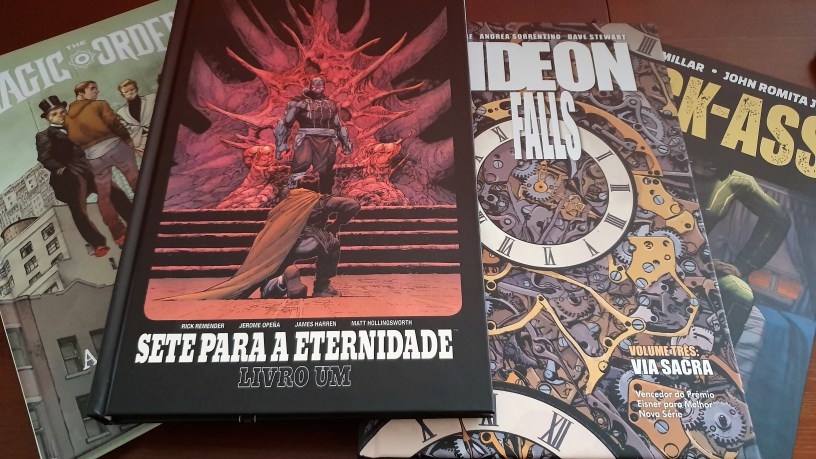 Já Sete para a Eternidade, de Rick Remender, situa-se num reino fantástico onde diferentes criaturas coexistem. Uma delas, capaz de ler a mente e de perceber o que cada um mais deseja, tece pesados acordos que o transformam num Imperador temido e capaz de corromper qualquer um. Ou quase qualquer um! E é aqui que se cria o conflito que dá origem à narrativa.