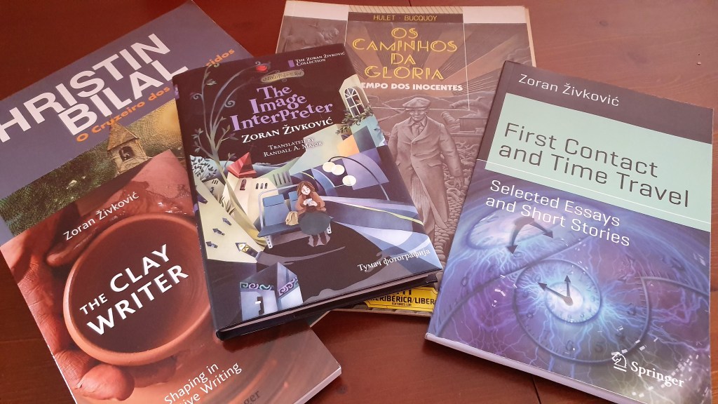 Para além dos livros de Zoran Zivovic, nesta foto vêem-se, ainda, duas banda desenhadas ganhas em leilão – uma porque o desenho me pareceu interessante, outra porque é da dupla Christin Bilal.