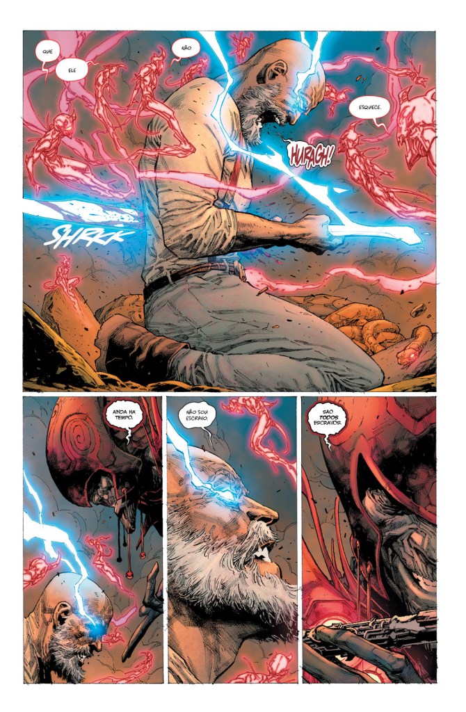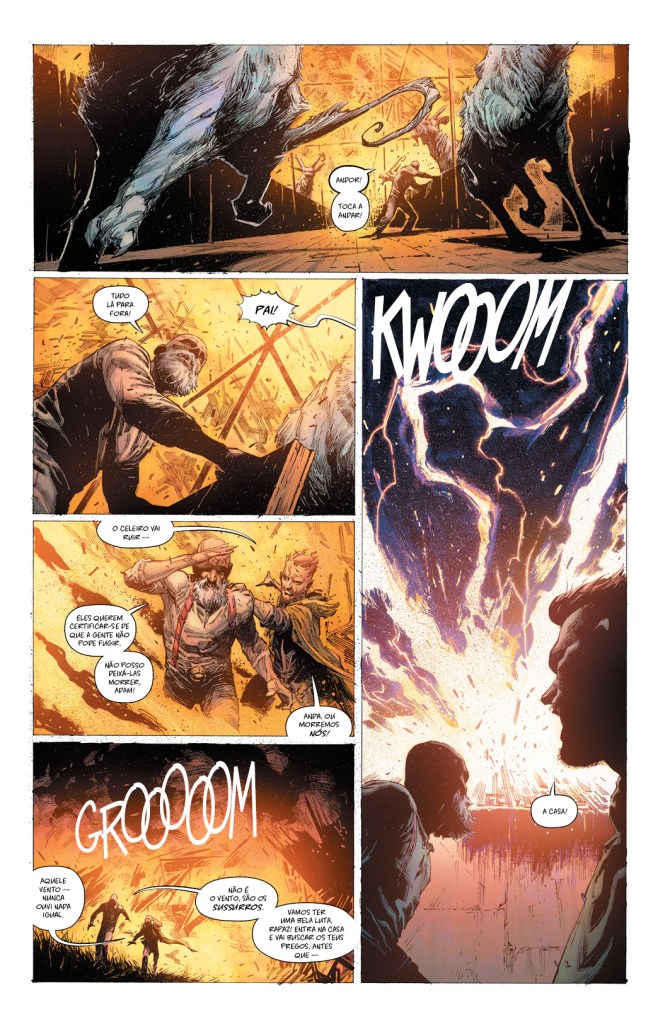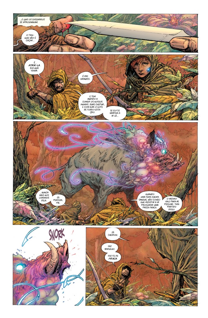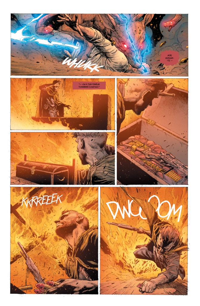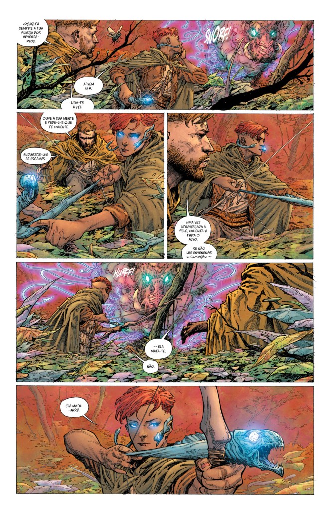 Sete para a Eternidade é a magistral saga de fantasia escrita por Rick Remender, e ilustrada por Jerome Opeña, uma dupla que já encontrámos nalguns arcos de história de Uncanny X-Force. Em Sete para a Eternidade, Remender constrói um universo de fantasia complexo e original, que lhe servirá de pano de fundo para contar uma história que é uma poderosa alegoria contra os populismos e as xenofobias e racismos, temas que são centrais nesta saga. Mas a estrutura da história é feita a partir da típica estrutura de um western, com um grupo de estranhos que se encontram para uma longa viagem, através de paisagens desertas e perigosas, um aspecto reforçado pelas cores maravilhosas de Matt Hollingsworth e a sua paleta de cores castanhas e próximas da terra, das montanhas, da vegetação seca e desolada do mundo de Zhal (e pela ocasional aparição de armas de fogo – mesmo que encantadas! – com um visual muito western).