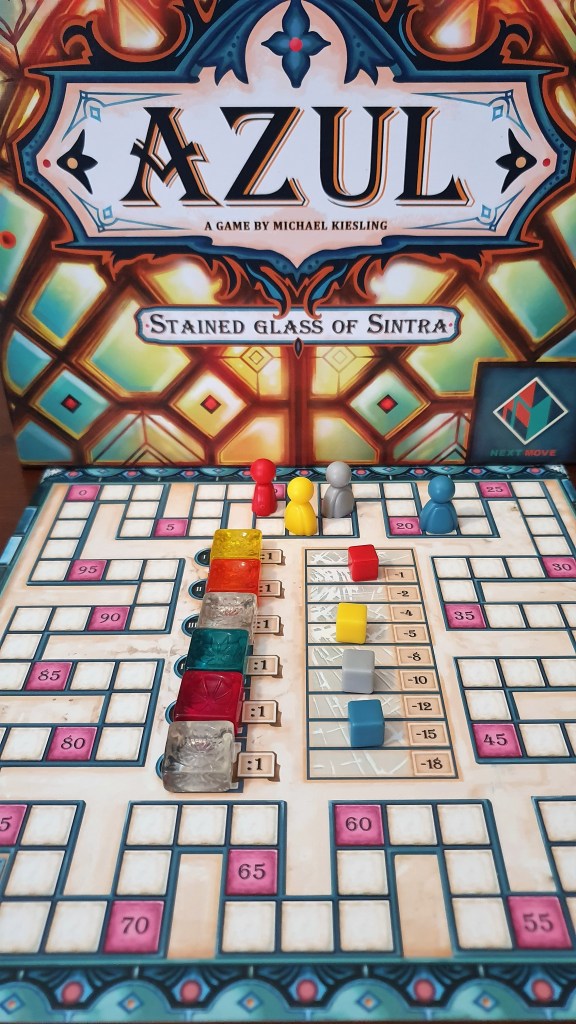 Comparando com os outros Azul, Stained Glass of Sintra (o segundo) este é o que mais se distingue. Tirando as fábricas e as regras de captação de peças, tudo o resto é distinto: a lógica dos padrões, a forma de pontuar e a sensação de jogo. O facto de não podermos colocar as peças em qualquer coluna (tendo de andar para trás e para a frente com um peão para assinalar as colunas – outras diferença que ainda não tinha falado porque não tem equivalência nos restantes) e a pontuação por colunas fazem-se com que seja, para mim, o menos elegante dos três. Não sinto neste Azul a coerência lógica dos outros três.