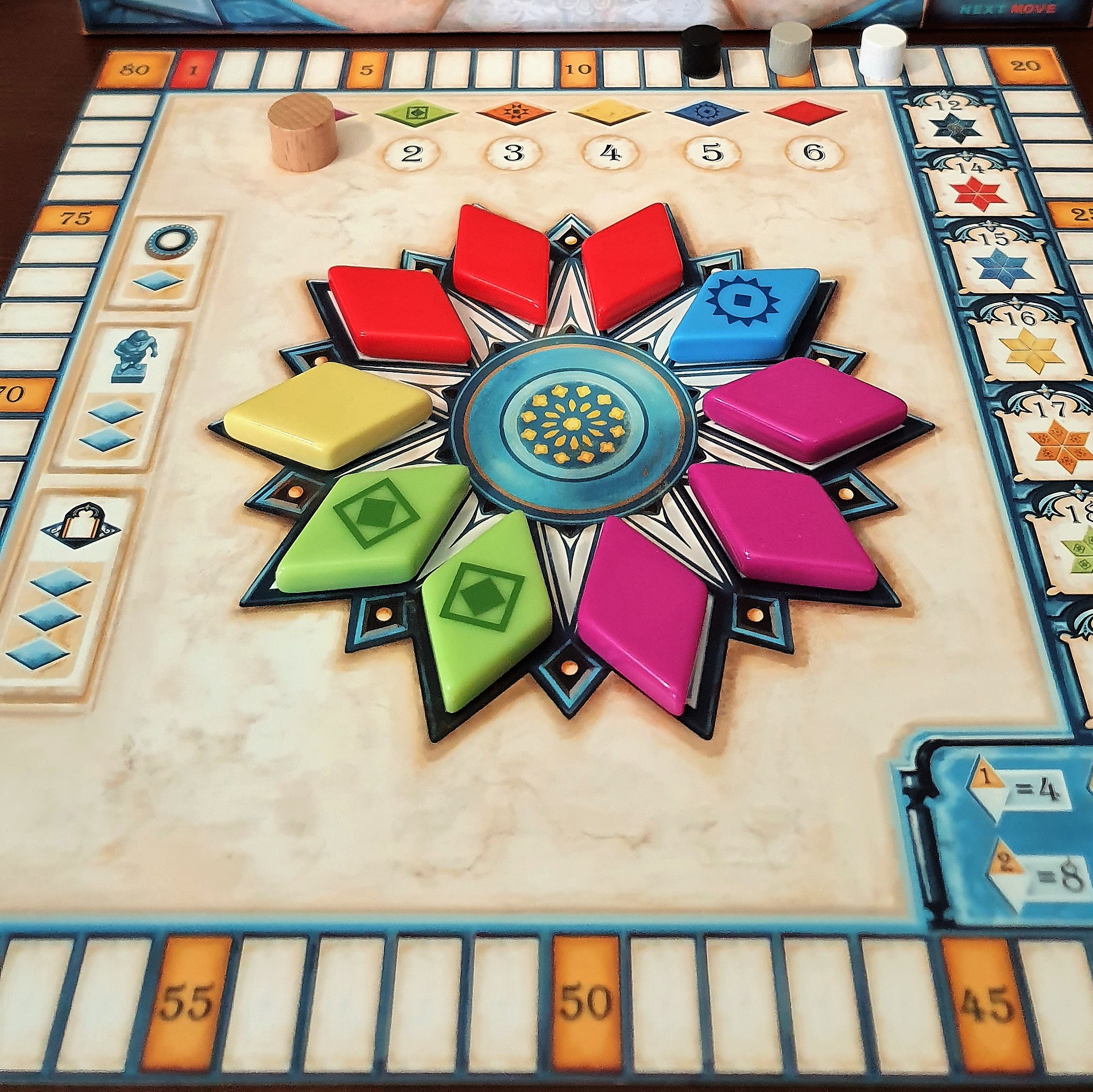 Como? Bem, para além dos padrões circulares, o tabuleiro contém algumas figuras dispersas ao longo do tabuleiro. Se conseguirmos rodear estas figuras com as peças colocadas, podemos escolher mais peças dum tabuleiro geral. Isto permite-nos escolher, no final da ronda, as colocações que nos dão mais peças, rodeando outras figuras, e obtendo ainda mais peças. Claro que este encadeamento tem um limite, dado que algumas das posições requerem muitas peças para ser preenchidas.
