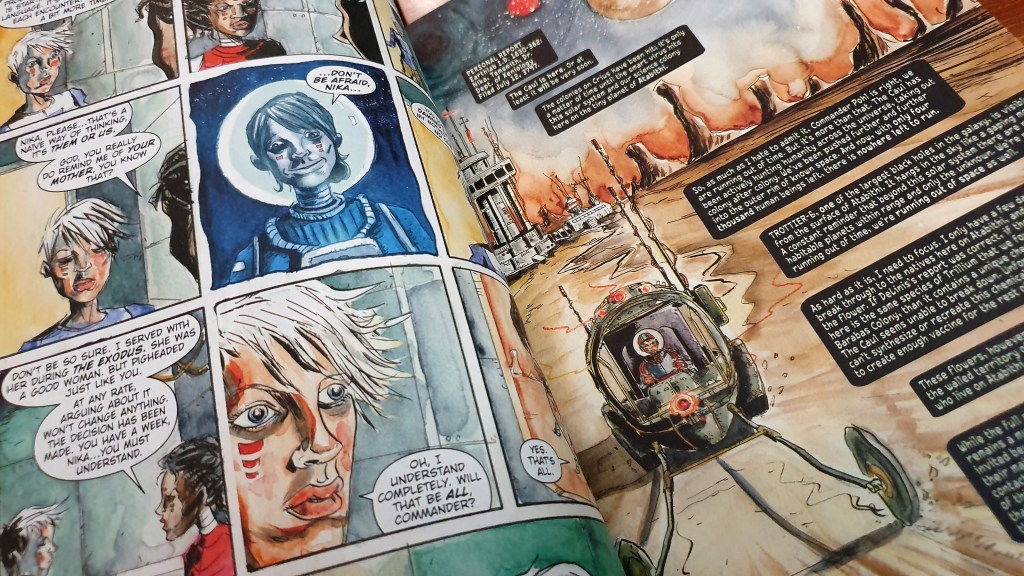 Entre as obras de Jeff Lemire encontramos uma obra de ficção científica. Não é a única do autor (recordo uma das séries de ficção científica que está no meu topo – Descender) mas distingue-se pela combinação de elementos de sub-géneros muito distintos: uma humanidade em extinção, a exploração de diferentes planetas, o confronto com uma espécie alienigena que vive em paz com a natureza e uma Londres de detalhes steampunk.