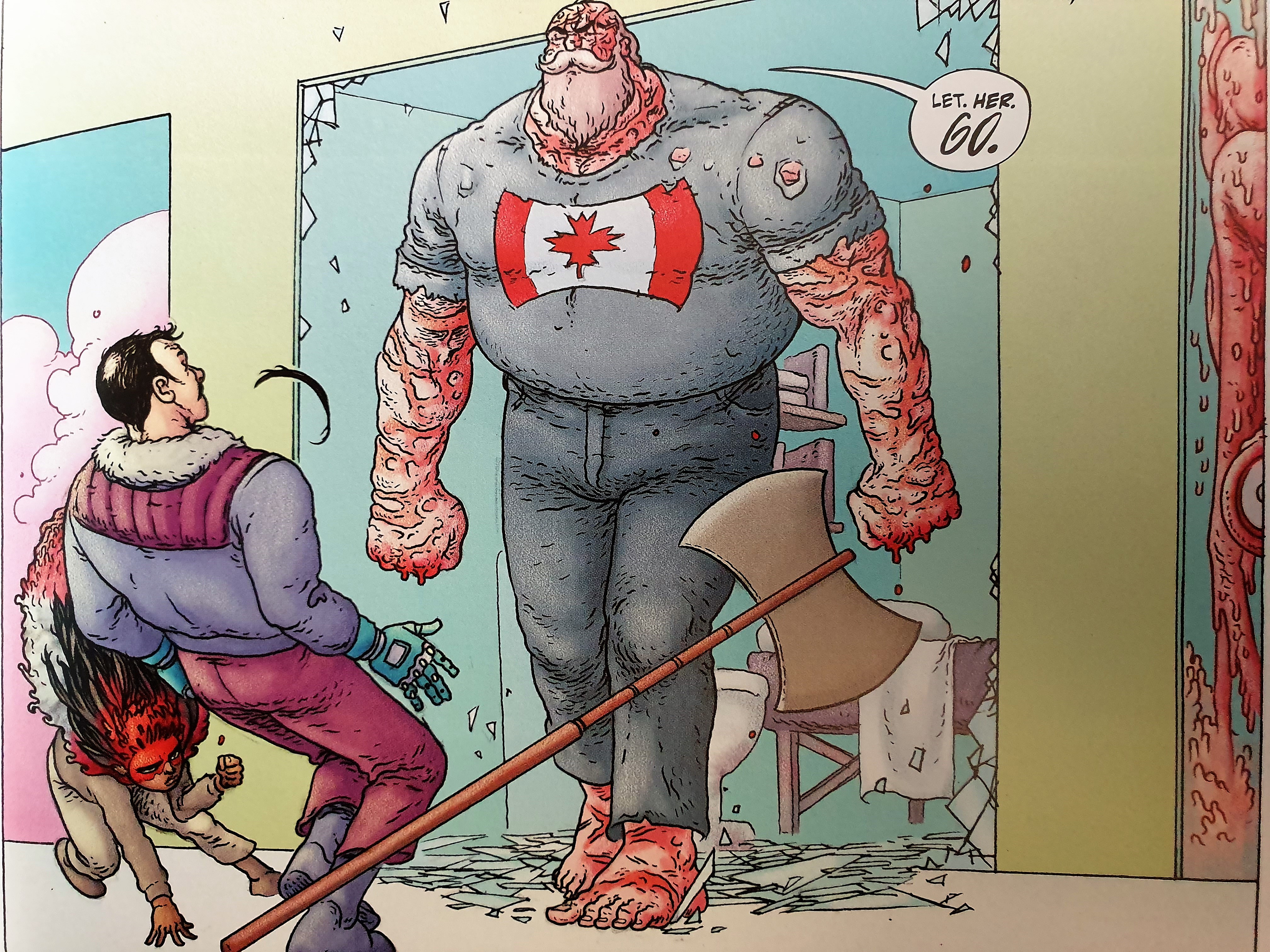 Esta estranheza narrativa é acompanhada pelo desenho. Os corpos e as feições das personagens apresentam proporções ligeiramente exageradas, e com grande diversidade de texturas. Em contraste, o fundo apresenta menos detalhe fazendo realçar as personagens, principalmente no Novo Vaticano, em que as cores são mais artificiais e as pessoas parecem não se encaixar no ambiente. Nota-se, também, que as cores usadas para retratar o Novo Vaticano e o Canadá são bastante diferentes – no primeiro usa-se um visual mais estéril, enquanto no segundo existem referências constantes à natureza, com o uso das cores associadas às florestas. Esta diferença cromática pode ser observada, também, nas personagens que têm origem nos dois mundos.