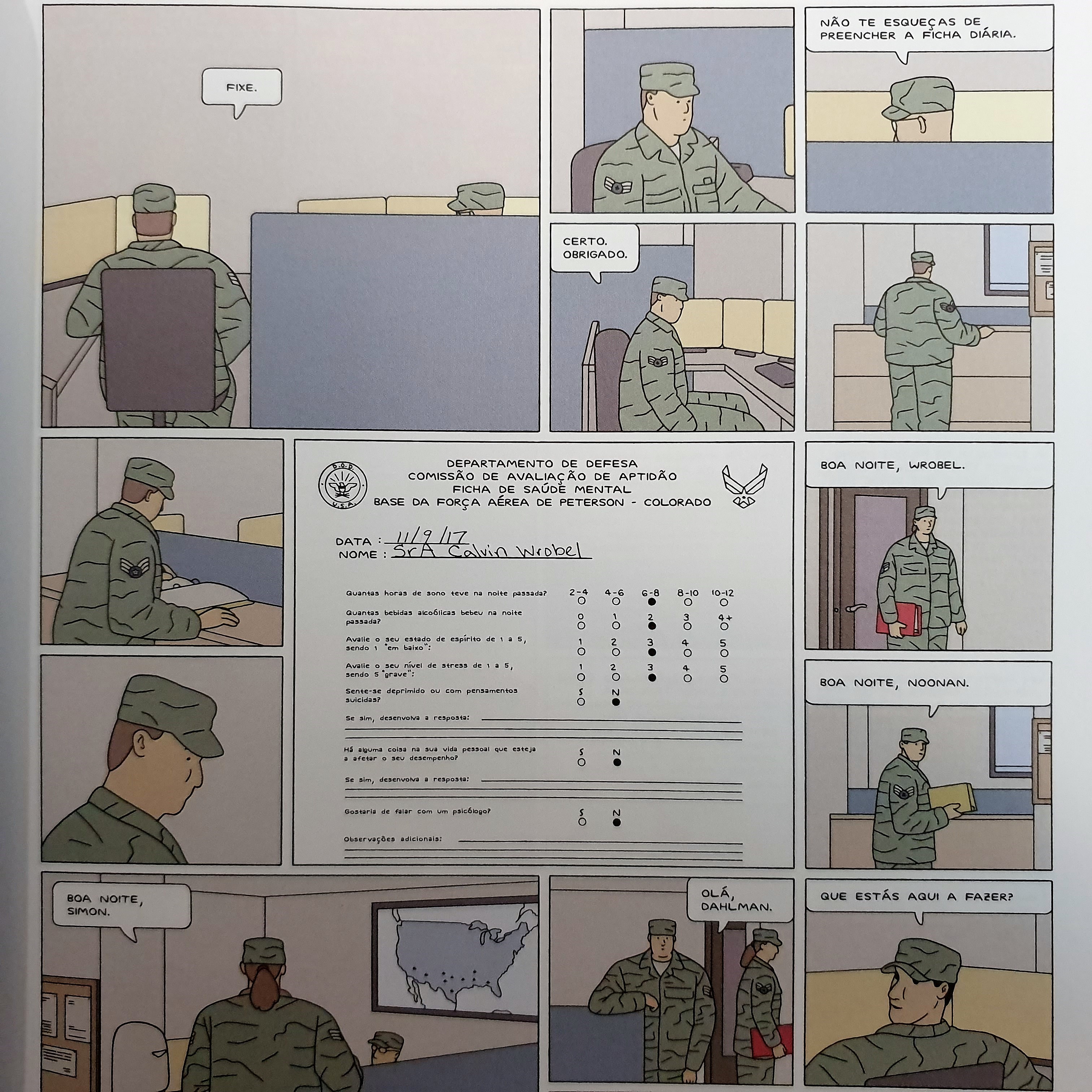 Já o desenho é simplista. Contém apenas as linhas necessárias para se apresentar, complementando a narrativa. Mostra distância e silêncio. Mostra personagens isoladas e cenários de pouca luz. Este visual minimalista permite apresentar a história despida de excessos, ainda que resulte em páginas pouco apelativas. Destaca-se o uso de um questionário diário de auto-avaliação do militar, Calvin, que vai apresentando o seu estado de espírito e contaminando a leitura das páginas seguintes.