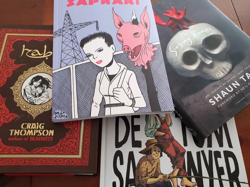 231 – The Singing Bones – Shaun Tan – Shaun Tan é conhecido pelos seus desenhos fabulosos. Aqui explora uma série de estátuas semi monstruosas ou pelo menos fabulásticas inspiradas em trechos dos contos de Grimm. Como tal, este livro apresenta uma sucessão das ditas estátuas, acompanhadas pelos trechos que as inspiraram. Não é, portanto, uma leitura para todos os fãs do trabalho de Shaun Tan, ainda que seja visualmente muito interessante;