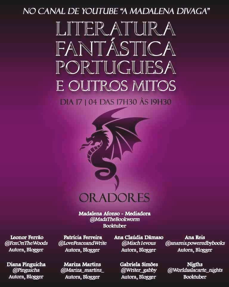 No próximo dia 17, 9 autoras / bloggers / booktubers irão estar à conversa para falar sobre literatura fantástica em Portugal no canal de youtube – A Madalena Divaga.