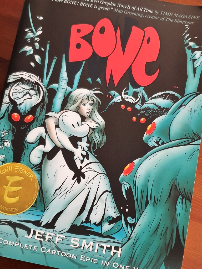 Bone é a história épica perfeita. Decorre num mundo fantástico, mas os elementos mágicos são ponderados e espaçados, necessários apenas pela manifestação de uma força maligna. Bone consegue introduzir as personagens e o contexto sem o sentimento usual de urgência no início mas com interacções cómicas, expressões e posturas. O desenvolvimento épico não é forçado mas algo que aparece naturalmente como uma resposta às circunstâncias. Mas ainda assim há espaço para explorar outros episódios narrativos interessantes, criando-se novas ligações e interacções. É, sobretudo, uma história capaz de cativar e de envolver, de detalhes fabulosos (nem falta uma obsessão literária, neste caso de Bone pelo livro Moby Dick) que deixa uma intensa sensação de saudade.