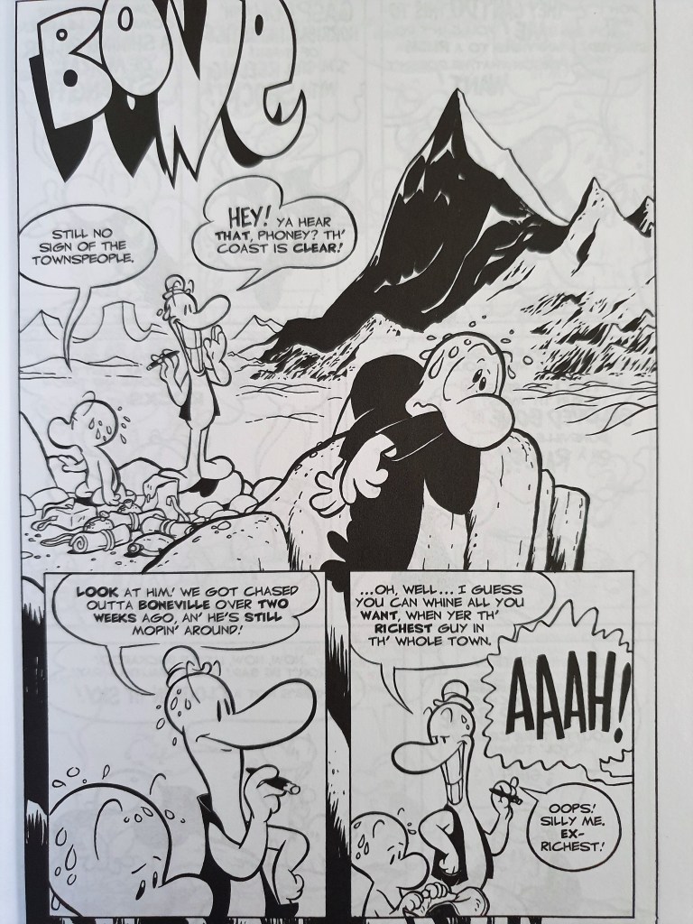 A história de Bone evolui lentamente de uma narrativa simples e pausada (salvo os iniciais episódios de perseguição pelas criaturas rato) para uma história épica. Os relacionamentos tornam-se mais fortes, segredos são descobertos, identidades são reveladas. Mas tudo isto ocorre de forma progressiva e suficientemente pausada para não ser estranhado pelo leitor.