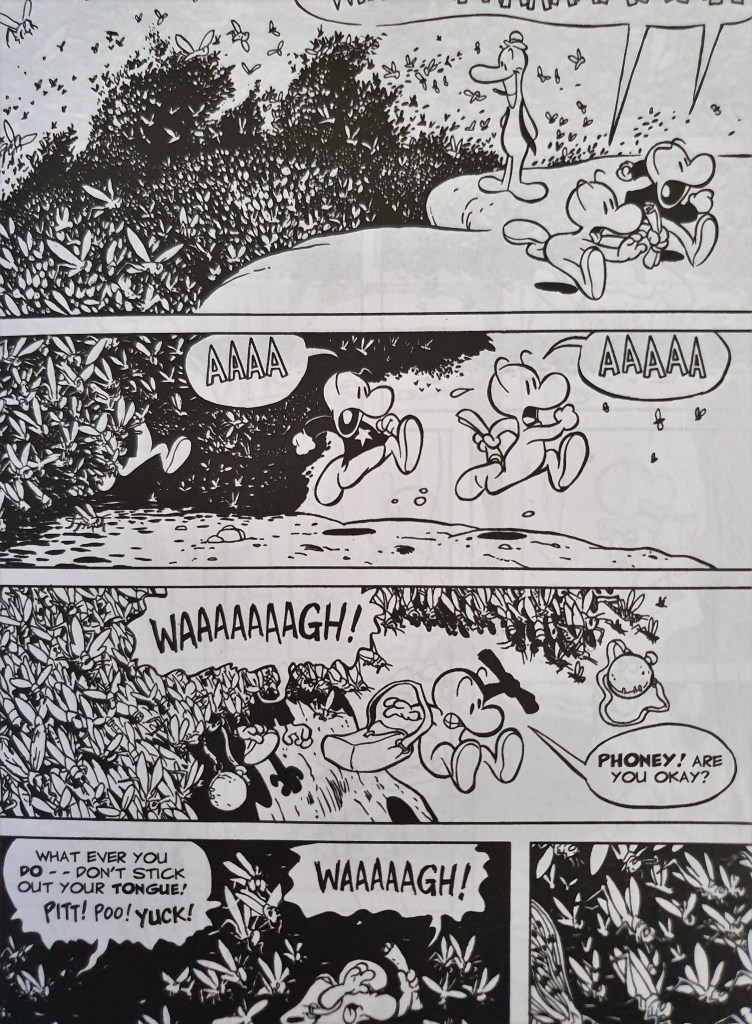 Outro elemento a realçar é a forma como o desenho tem um papel muito interessante na criação de suspense e de tensão, conseguindo o autor eliminar, quase na totalidade, qualquer escrita – não é necessária! E é nesta expressividade total do desenho que se revela outro dos elementos de genialidade de Bone.