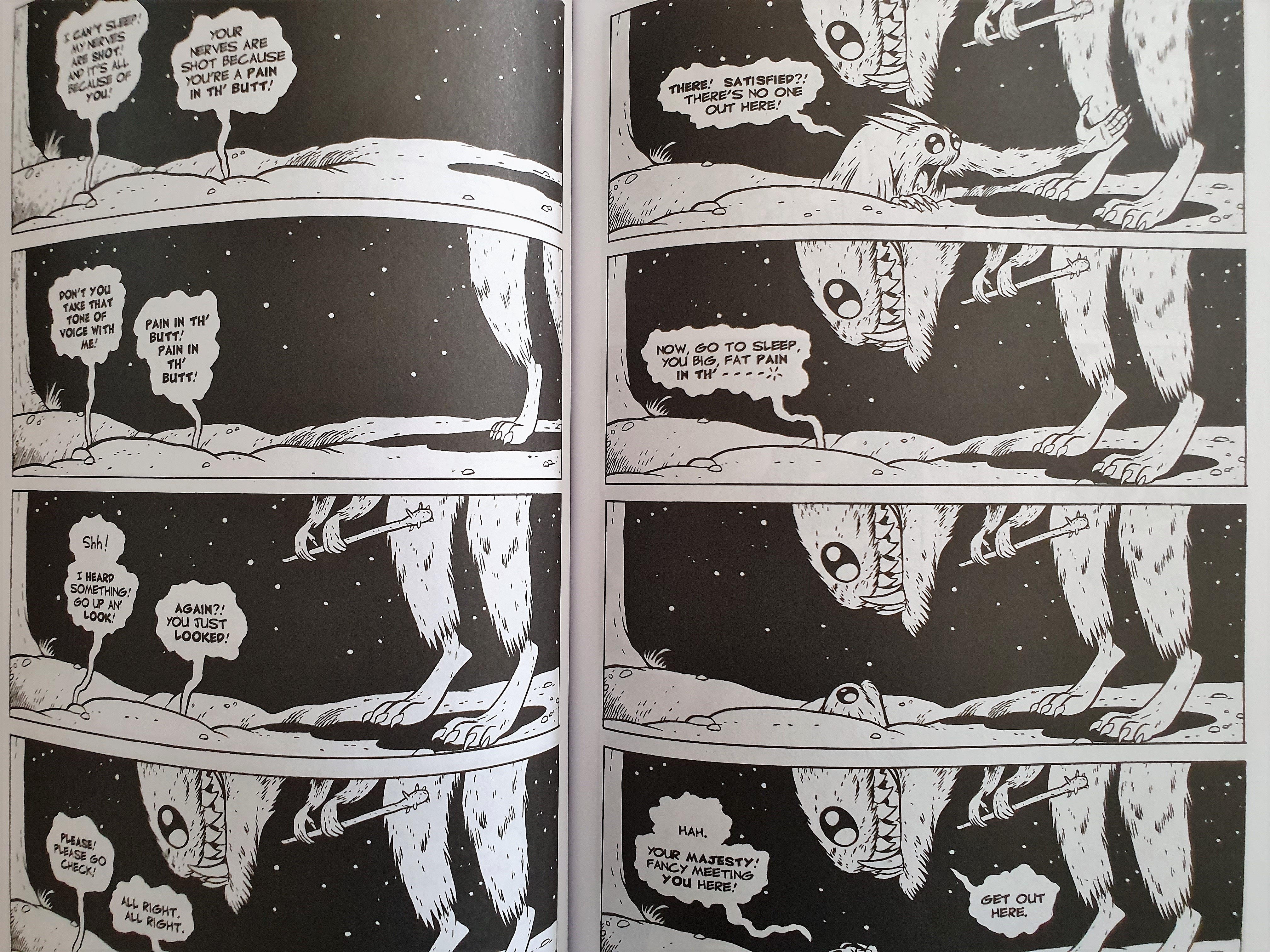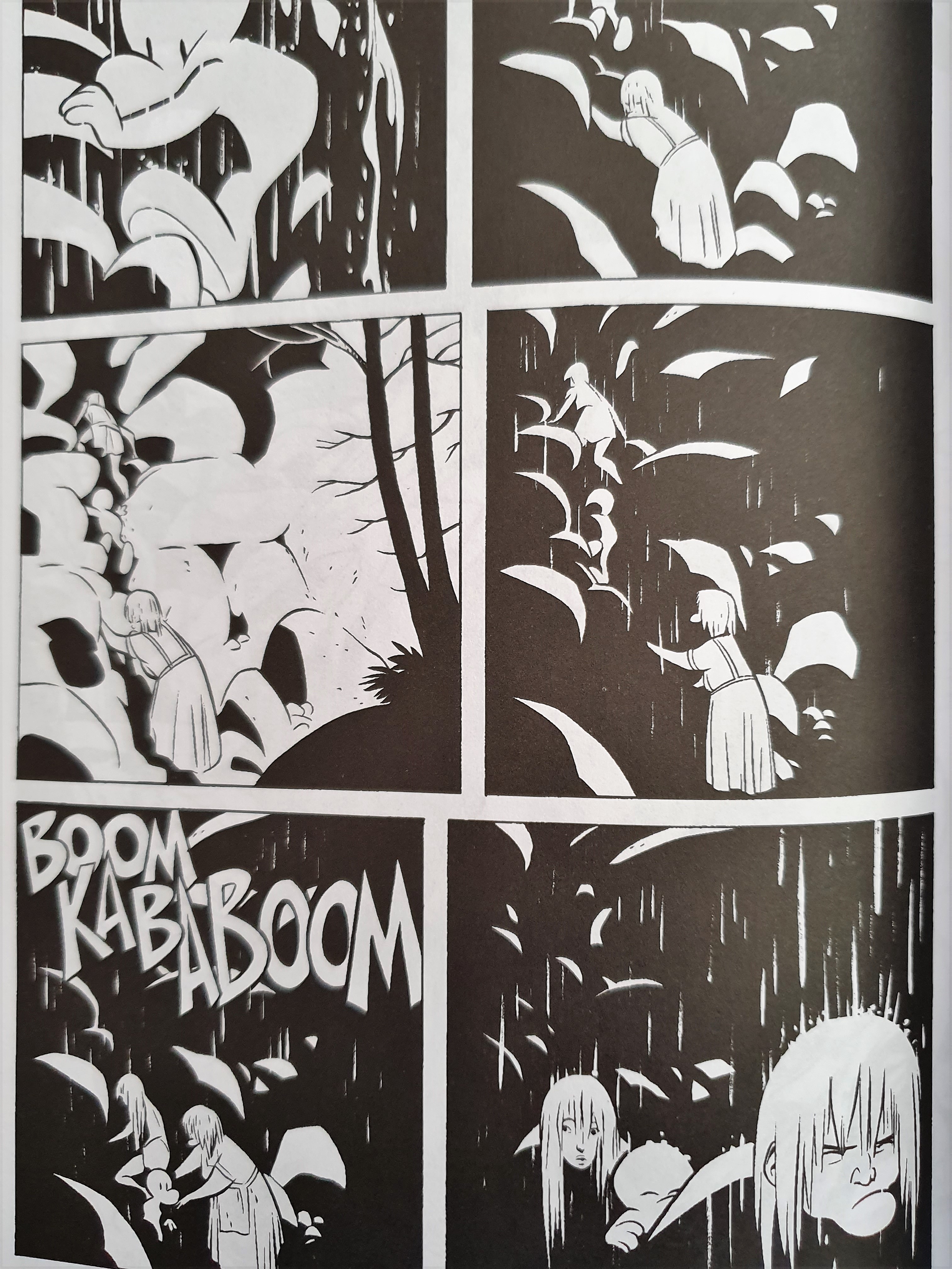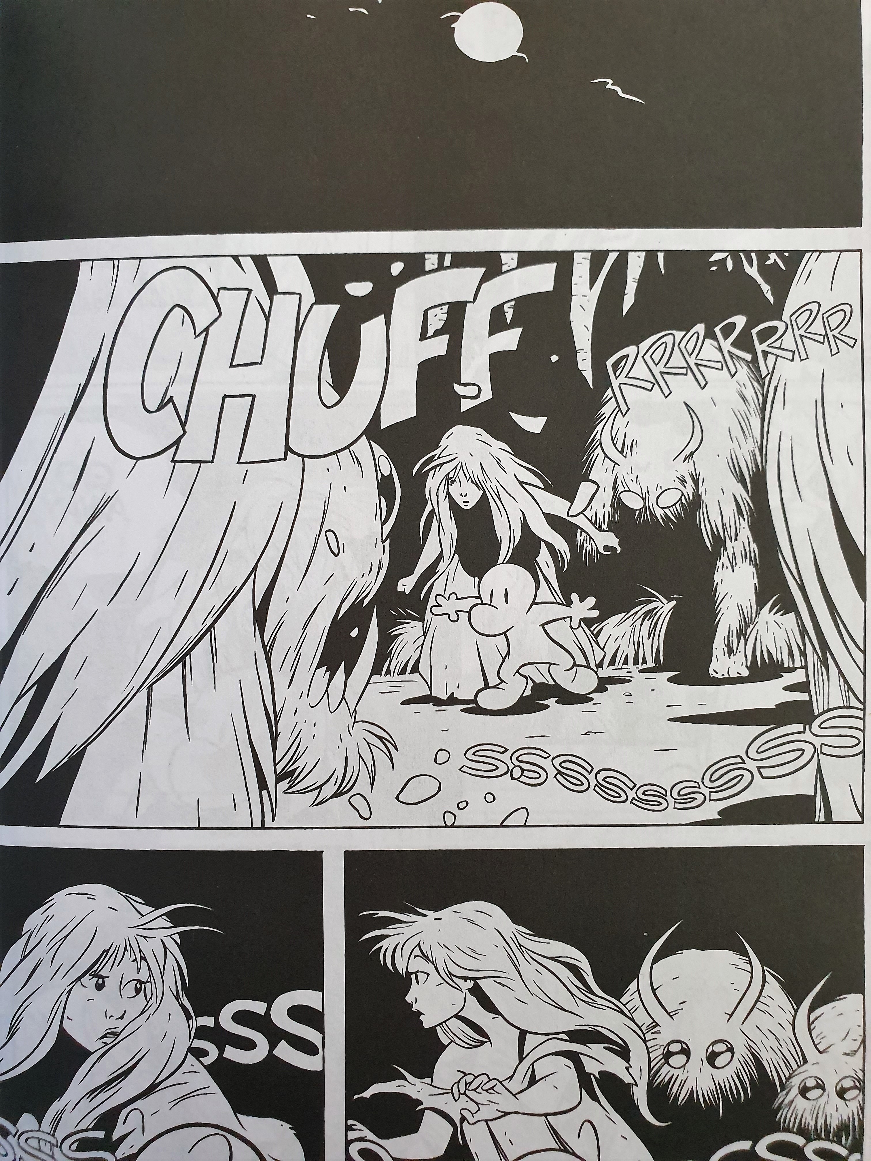 Ainda que exista uma versão a cores mais recente, o original é a preto e branco. Mas, sinceramente, não senti aqui a necessidade de cor. O autor usa o preto de diferentes formas consoante o episódio, conseguindo usá-lo para representar paisagens detalhadas, fazer jogos de luzes durante uma trovoada, ou destacar os pesadelos mágicos e criar um ambiente negro apropriado.