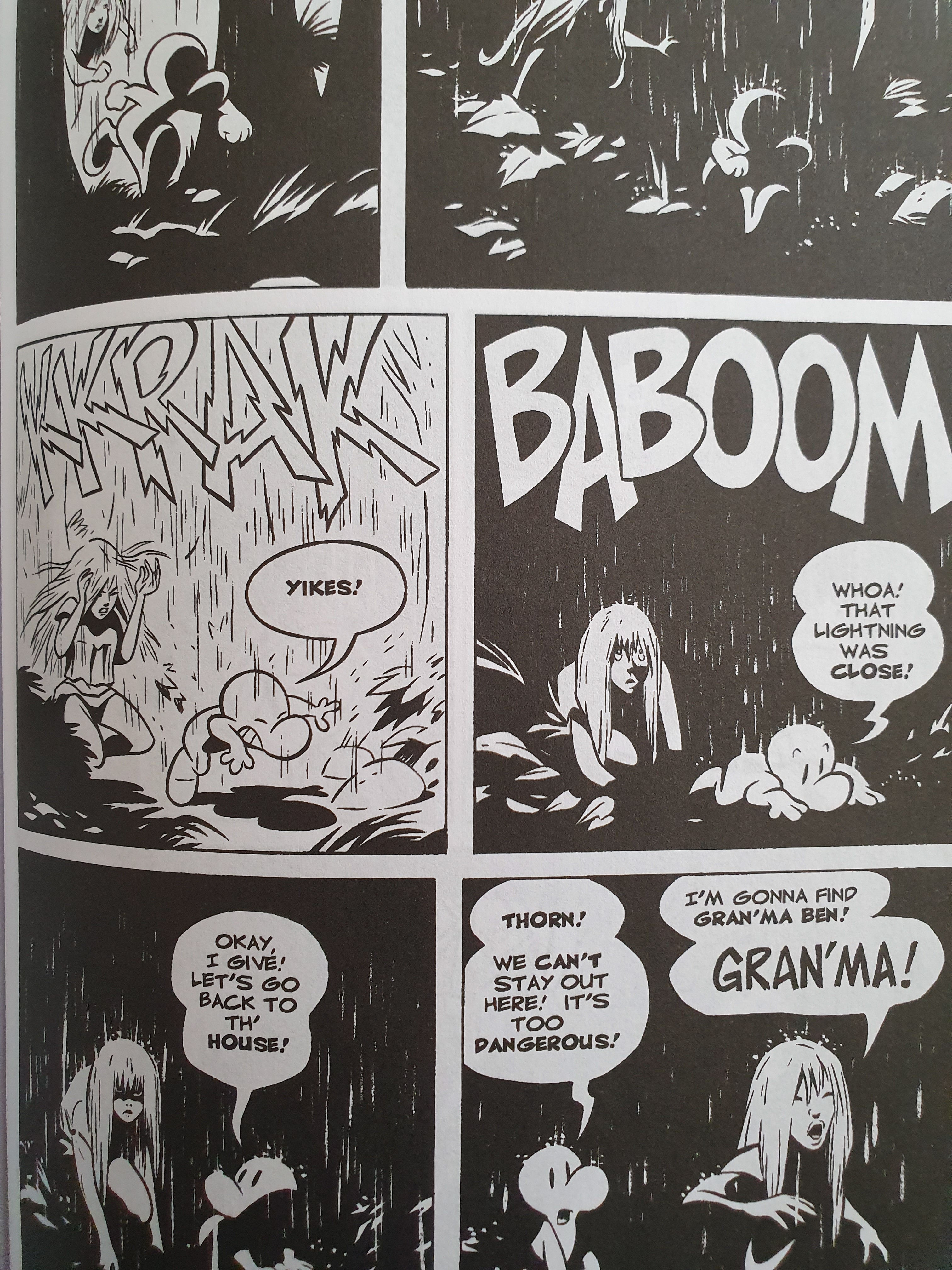 Ainda que Fone Bone seja a personagem principal, não é ele o herói principal, mas Thorn. A jovem deixa parte da sua inocência e descobre os seus poderes – mas, novamente, não são poderes fantásticos e fabulosos. São poderes perigosos que despertam pesadelos e trazem inquietação, levando à revelação de vários segredos infelizes. O caminho que espera os nossos heróis será duro e, como uma história épica, existem fazes de demanda, em que se unem esforços. Existem traições e acções idiotas, mas também actos de coragem e episódios carregados de empatia. Sente-se uma progressão no caminho do destino que os leva a enfrentar um perigo real.