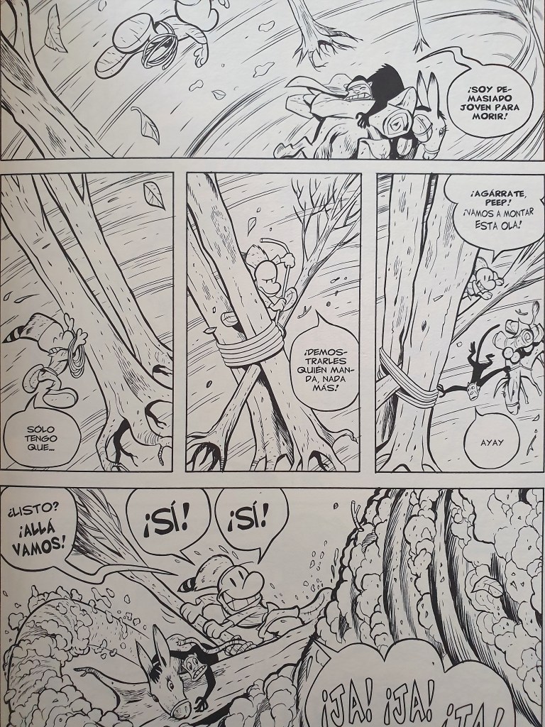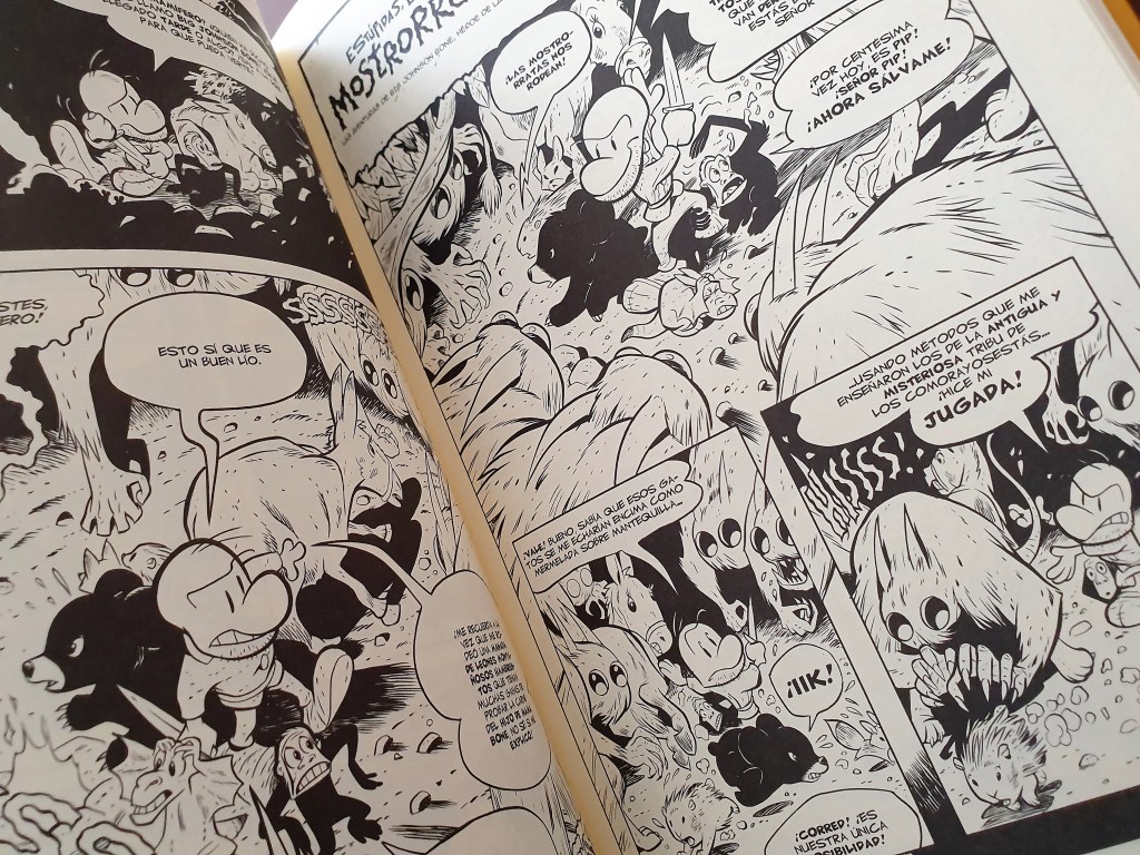 Já as duas histórias de Estúpidas, Estúpidas Mostrorratas são geniais. A primeira apresenta uma personagem diferente e peculiar um aventureiro com histórias pouco credíveis que vive uma aventura ainda mais mirabolante que envolve as criaturas-rato. É uma história divertida e envolvente que pega nas pequenas criaturas do bosque, caracterizando-as de forma semelhante à apresentada em Bone.